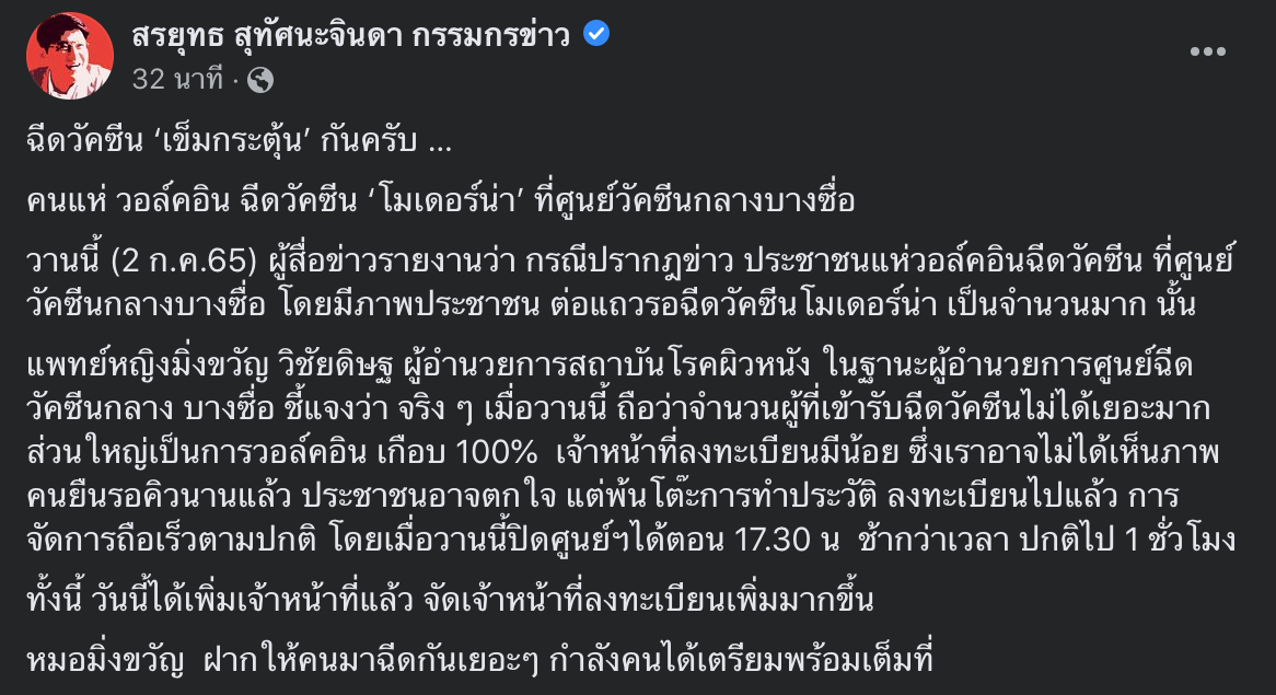 ล่าสุด เพจ สรยุทธ สุทัศนะจินดา กรรมกรข่าว ได้โพสต์คลิปภาพบรรยากาศ ประชาชนแห่วอล์คอิน เพื่อรับ วัคซีนกระตุ้น ซึ่งเป็นการฉีด วัคซีนโมเดอร์น่า ณ ศูษย์ฉีดสถานีกลางบางซื่อ