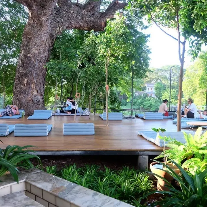 เป็นบ้านเล็กๆ สไตล์โมเดิร์น บรรยากาศอบอุ่น บริการอาหารไทย เบเกอรี่ และเครื่องดื่มโฮมเมด มีที่นั่งให้เลือกทั้งแบบอินดอร์ และเอาท์ดอร์ ในส่วนของเอาท์ดอร์ คุณจะรู้สึกเสมือนพักผ่อนอยู่ที่บ้าน เพราะร้านใช้ฟูกบริการลูกค้า ซึ่งมีทั้งฟูกบนม้านั่ง และฟูกบนพื้น ใครสะดวกแบบไหนก็ตามสบายเลย ได้ทั้งนั่งและนอนชมวิว พร้อมทานอาหารและจิบเครื่องดื่มชิลๆ กับบรรยากาศริมน้ำ สมชื่อร้าน ‘ล้มบนฟูก’ จริงๆ