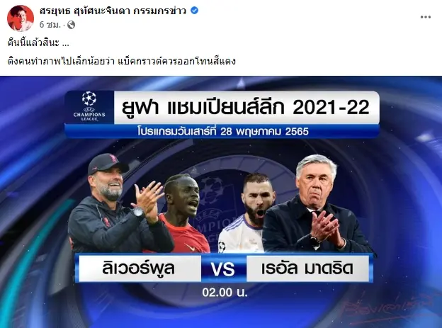 โดย สรยุทธ หนึ่งในแฟนบอลพันธุ์แท้ ลิเวอร์พูล ได้ออกมาโพสต์เรียกน้ำย่อยผ่านทางเฟซบุ๊สรยุทธ สุทัศนะจินดา กรรมกรข่าว เป็นภาพโปรแกรมการแข่งขัน นัดชิงลิเวอร์พูล พบ เรอัล มาดริด ซึ่งเป็นภาพของ เจอร์เก้น คล็อปป์ กุนซือลิเวอร์พูล และ คาร์โล อันเชลอตติ หัวหน้าผู้ฝึกสอน เรอัล มาดริด