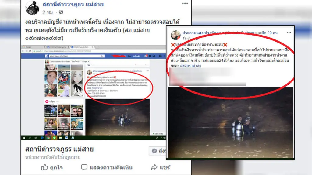 - กลุ่มมิจฉาชีพทางโซเชียลที่อ้างตัวออกมาเปิดรับบริจาค เพื่อที่จะนำเงินไปซื้ออาหารให้ทีมค้นหา โดยทางเจ้าหน้าที่ตำรวจได้ได้ทำการตรวจสอบและติดต่อไปยังเจ้าของเฟสบุ๊คแล้ว ต่อทางเจ้าของได้ออกมาขอโทษ และ ทำการลบข้อความออกไป