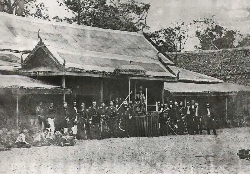 พระบาทสมเด็จพระจอมเกล้าเจ้าอยู่หัว ทรงฉายภาพร่วมกับเจ้าเมืองสิงคโปร์และแขกต่างประเทศ ณ ค่ายหลวงหว้ากอ