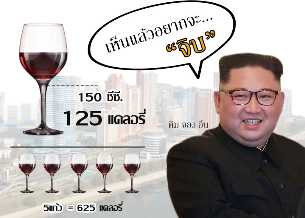 เมนูที่ คิม จอง อึน ชื่นชอบมากๆ นั่นก็คือ “ไวน์แดง” ที่ไม่ว่าจะไปที่ไหน เค้าจะติดไวน์แดงชั้นเลิศไปด้วยทุกครั้ง ส่วนไวน์แดง ปริิมาณ 150 ซีซี. มีแคลอรี่ต่อ 1 แก้ว สูงถึง 125 แคลอรี่ คิดดูสิ จิบไวน์ไม่ได้หยุดแค่แก้วเดียวแน่ๆ คุณคิดดู คุณจิบไวน์แดง 5 แก้ว ปริมาณแคลอรี่ จะเท่ากับ 625 แคลอรี่เลยนะ นี่ยังไม่รวมอาหารหรือของทานเล่นที่เข้าไปเพิ่มเเคลอรี่ในร่างกายให้คุณอีกนะ