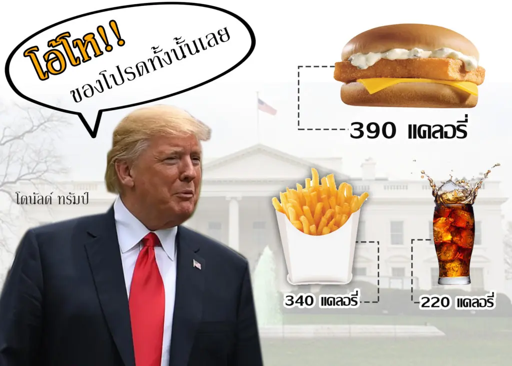 ทรัมป์ ขึ้นชื่อว่าเป็นแฟนคลับตัวยงของ “แมคโดนัล” แทบจะเรียกได้ว่า ทรัมป์กินแมคโดนัลบ่อยกว่าร้านอื่นๆ เลยทีเดียว และเมนูที่เค้าชื่นชอบมากที่สุด ก็คือเมนู The Filet-o-Fish sandwich หรือ ที่บ้านเราเรียกว่า “แมคฟิช”  ให้ปริมาณแคลอรี่สูงถึง 390 แคลอรี่ แต่อย่าลืมบวกแคลอรี่ในเมนูทานเล่นหรือเครื่องดื่ม อย่าง