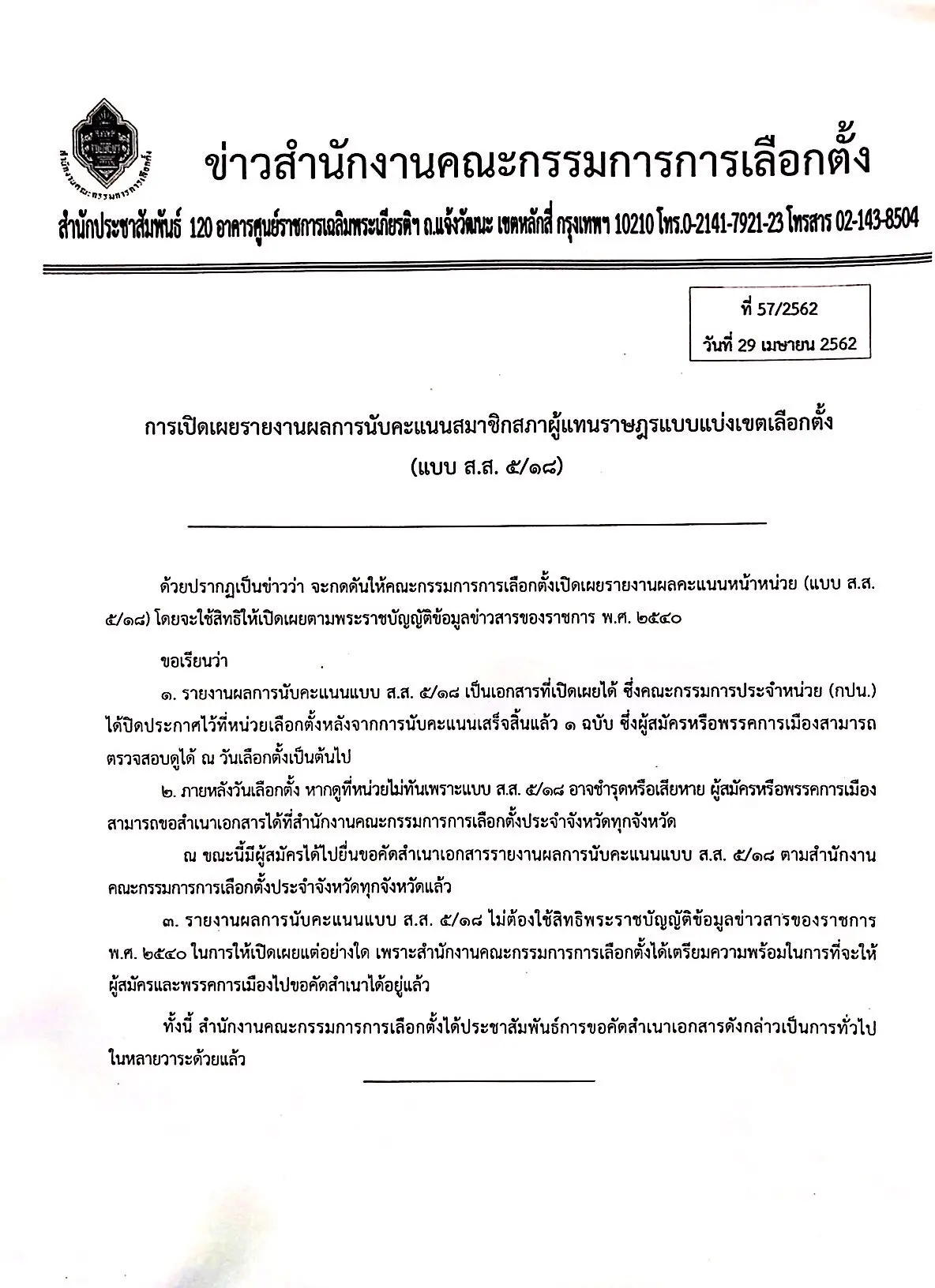 29 เม.ย.62-เวลา 14.40 น. นายแสวง บุญมี รองเลขาธิการคณะกรรมการการเลือกตั้ง(กกต.) แถลงว่า สำหรับการเปิดเผยรายงานผลการนับคะแนนส.ส. แบบแบ่งเขตเลือกตั้ง (แบบ ส.ส.5/18) นั้น ด้วยปรากฏเป็นข่าวว่า จะกดดันให้กกต.เปิดเผยรายงานผลคะแนนหน้าหน่วย (แบบ ส.ส. 5/18) โดยจะใช้สิทธิให้เปิดเผยตาม พระราชบัญญัติข้อมูลข่าวสารของราชการ พ.ศ.2540 กกต.ขอเรียนว่า 1.การรายงานผลการนับคะแนนแบบ ส.ส. 5/18 เป็นเอกสารที่เปิดเผยได้ ซึ่งคณะกรรมการประจำหน่วย (กปน.) ได้ปิดประกาศไว้ที่หน่วยเลือกตั้ง หลังจากการนับคะแนนเสร็จสิ้นแล้ว 1 ฉบับ ซึ่งผู้สมัครหรือพรรคการเมืองสามารถตรวจสอบ ณ วันเลือกตั้งเป็นต้นไป 2.ภายหลังวันเลือกตั้ง หากดูที่หน่วยไม่ทัน เพราะแบบ ส.ส.5/18 อาจชำรุดเสียหาย ผู้สมัครหรือพรรคการเมืองสามารถขอสำเนาเอกสารได้ที่ กกต.จังหวัด โดยขณะนี้มีผู้ได้ไปยื่นขอคัดสำเนาเอกสารรายงานผลการนับคะแนนแบบ ส.ส.5/18 ตามสำนักงาน กกต.จังหวัดทุกจังหวัดแล้ว