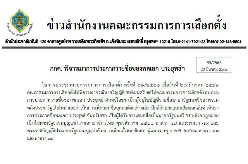 มติ กกต.เอกฉันท์ ! ประกาศชื่อ “ประยุทธ์” เป็นแคนดิเดตชอบด้วยกฎหมาย