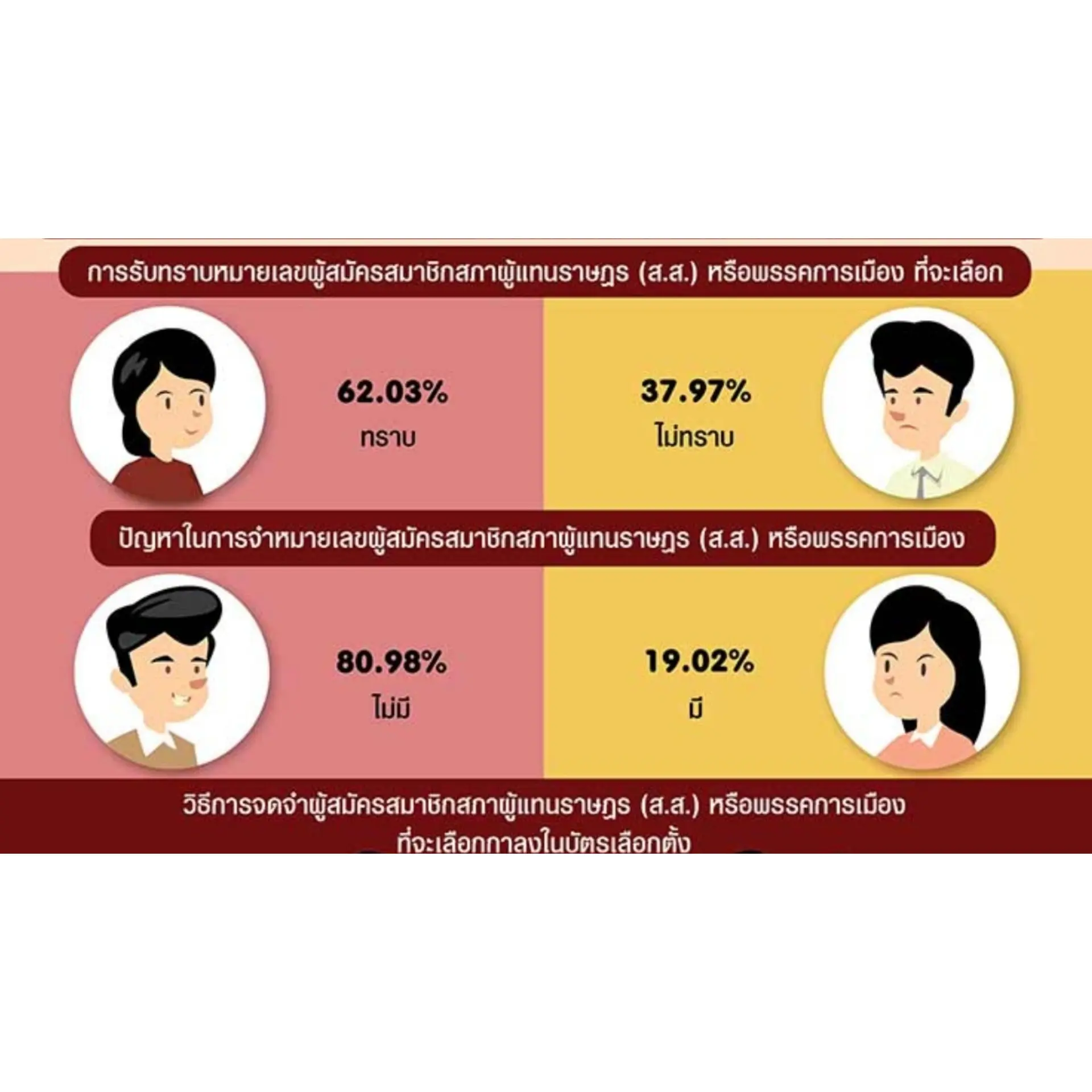 สำหรับการรับทราบหมายเลขผู้สมัครสมาชิกสภาผู้แทนราษฎร (ส.ส.) หรือ พรรคการเมือง ที่ท่านจะเลือก พบว่า ประชาชนส่วนใหญ่ ร้อยละ 62.03 ระบุว่า ทราบหมายเลขผู้สมัครสมาชิกสภาผู้แทนราษฎร (ส.ส.) หรือ พรรคการเมือง และร้อยละ 37.97 ระบุว่า ไม่ทราบหมายเลขผู้สมัครสมาชิกสภาผู้แทนราษฎร (ส.ส.) หรือ พรรคการเมือง