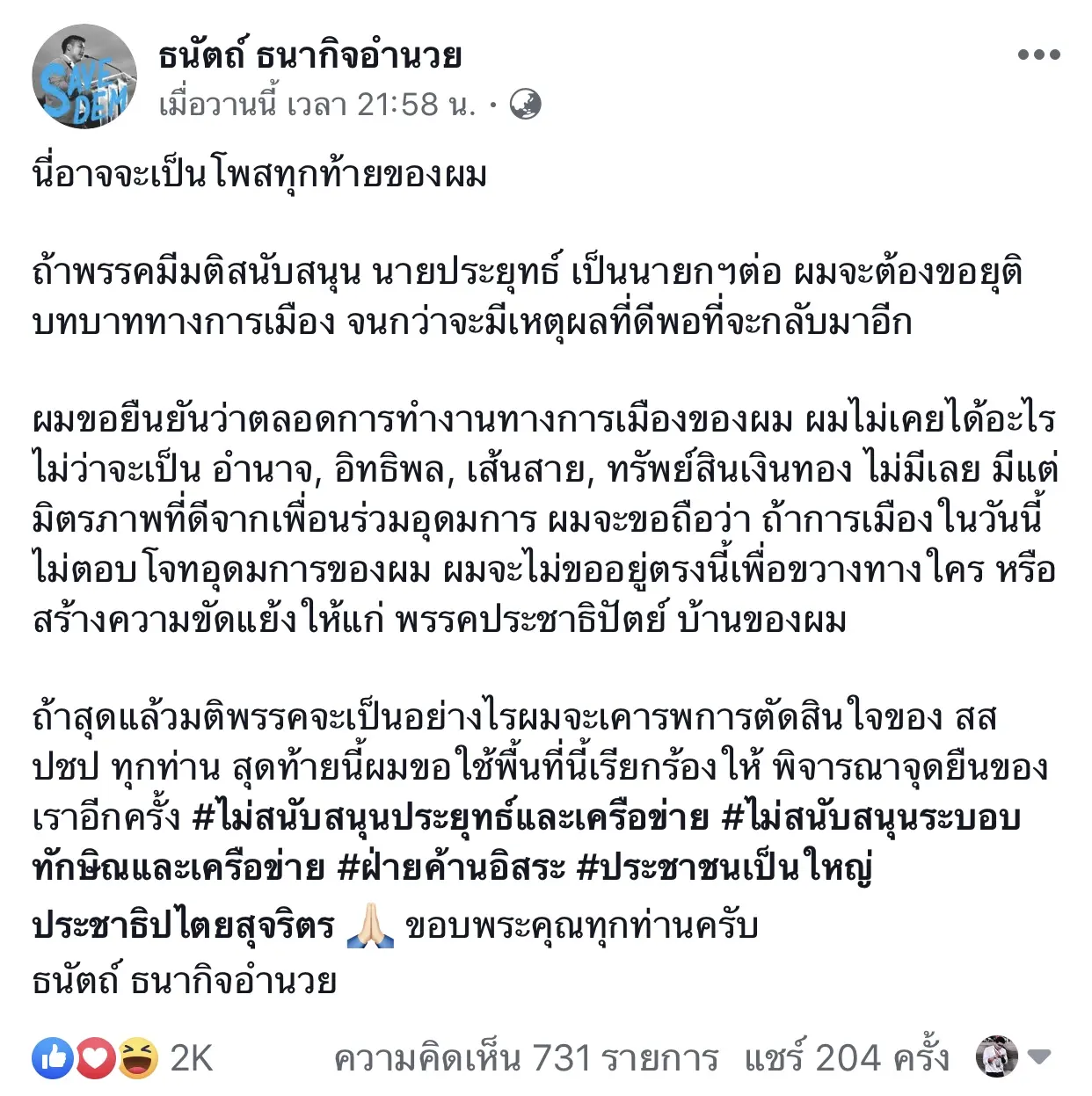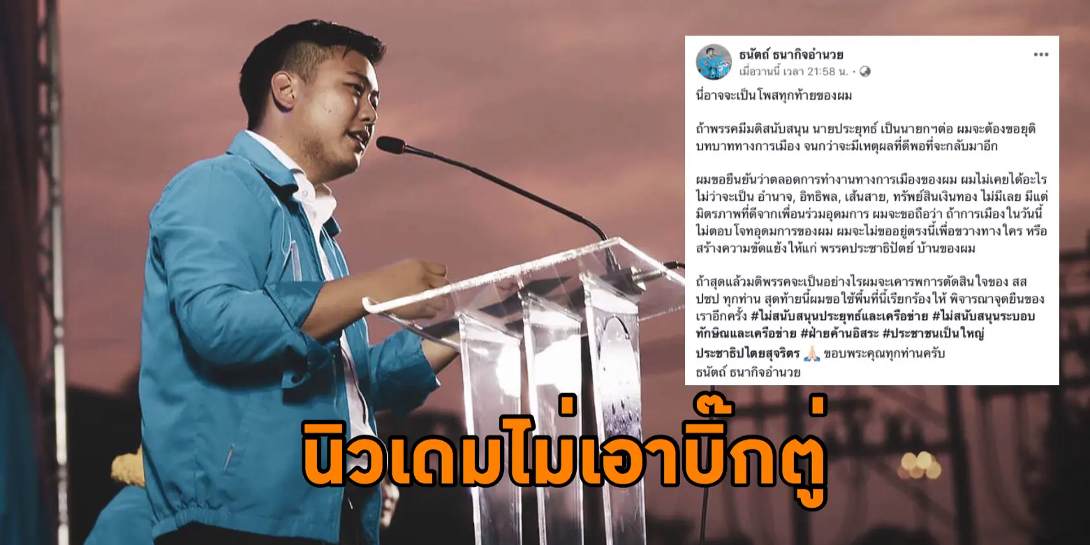 “ถ้าสุดแล้วมติพรรคจะเป็นอย่างไรผมจะเคารพการตัดสินใจของ สส ปชป ทุกท่าน สุดท้ายนี้ผมขอใช้พื้นที่นี้เรียกร้องให้ พิจารณาจุดยืนของเราอีกครั้ง #ไม่สนับสนุนประยุทธ์และเครือข่าย #ไม่สนับสนุนระบอบทักษิณและเครือข่าย #ฝ่ายค้านอิสระ #ประชาชนเป็นใหญ่ประชาธิปไตยสุจริต ขอบพระคุณทุกท่านครับ”