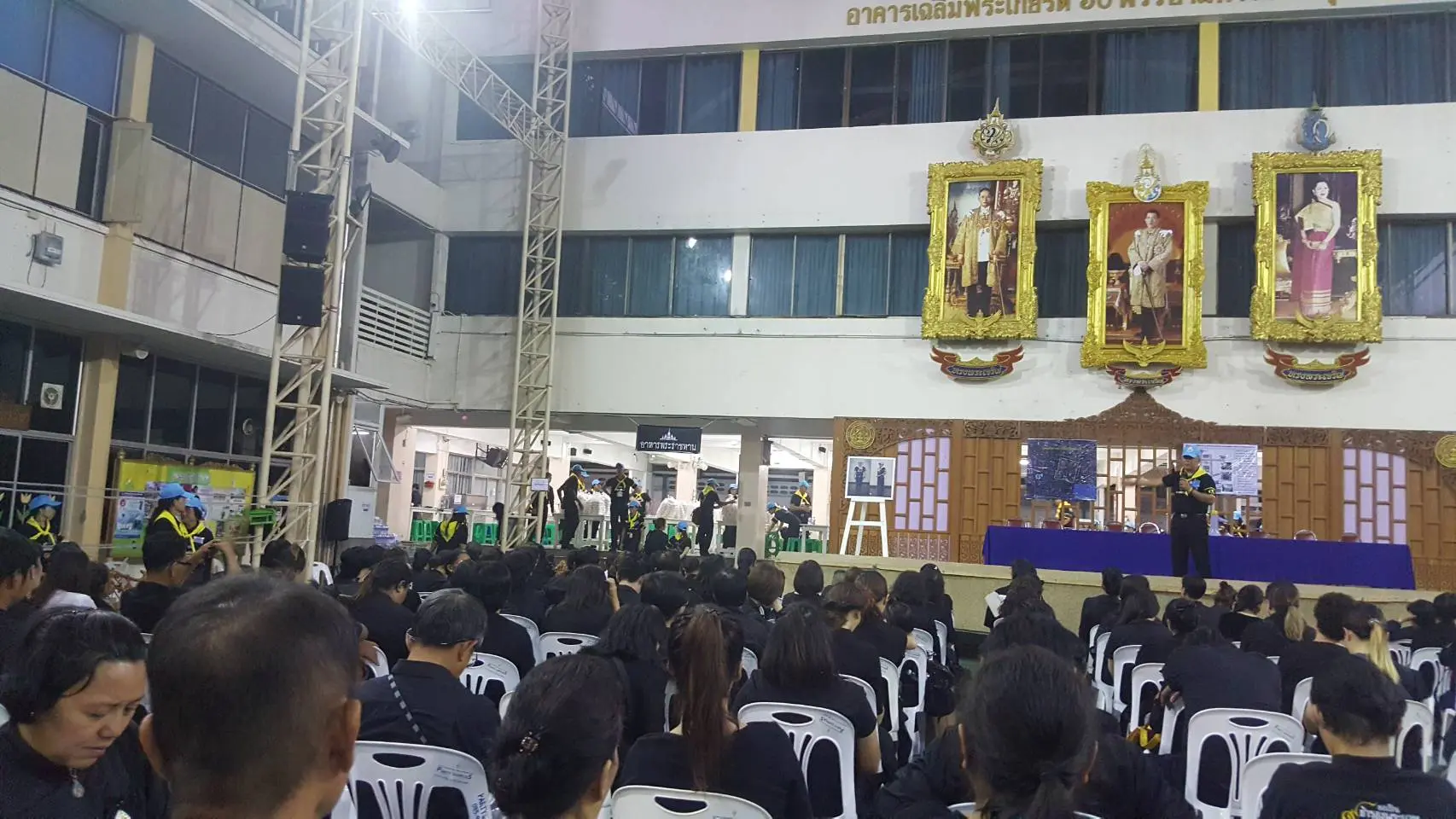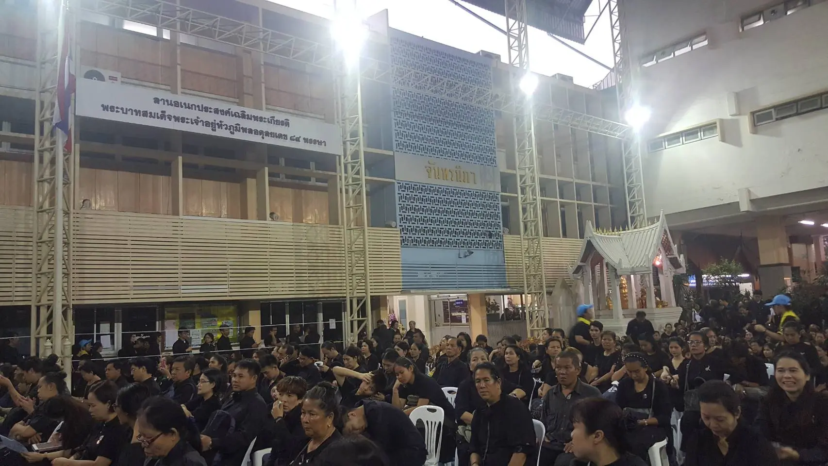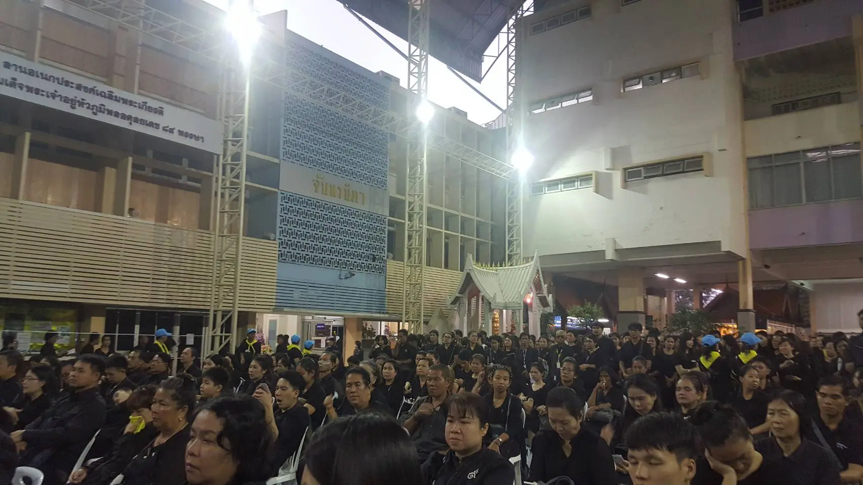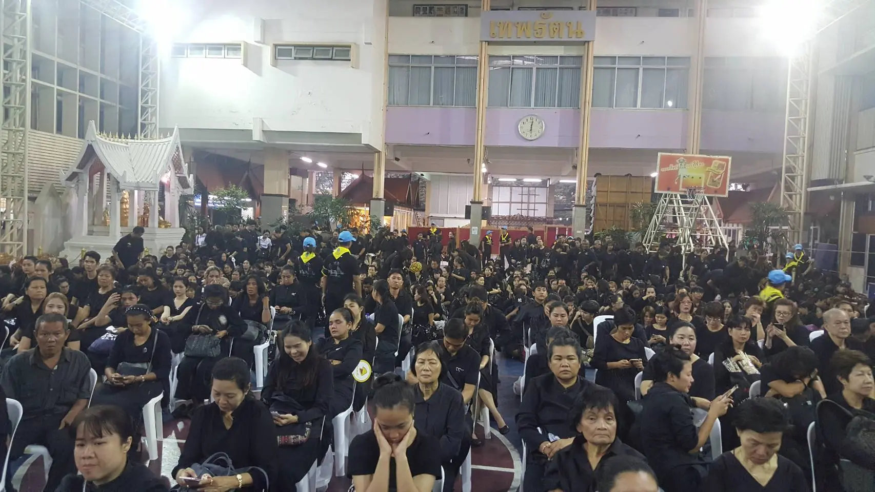 06.20 น. ประชาชนจำนวนมากนั่งรอรับบัตรคิวเพื่อวางดอกไม้จันทร์ ณ พระเมรุมาศจำลอง (ลานคนเมือง) ที่ รร.เบญจมราชาลัย
