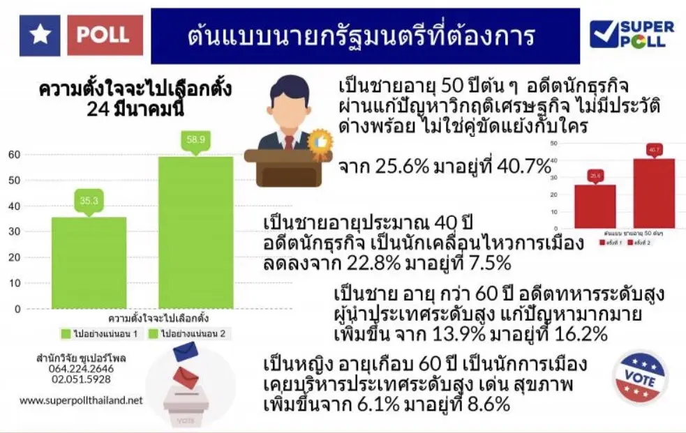 “ซูเปอร์โพล” เปิดสำรวจปชช. เรื่อง “ต้นแบบนายกรัฐมนตรีที่ต้องการ” พบ 40 % อยากได้นายกฯ อายุ 50 ต้น ประวัติไม่ด่างพร้อย-ไม่ขัดแย้ง-แก้เศรษฐกิจ อีก 58 % ไปเลือกตั้งแน่นอน