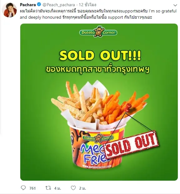 แฟนคลับช่วยเช็ดน้ำตา พีช พชร ด้วยการต่อแถวยาวเหยียด อุดหนุนธุรกิจเฟรนช์ฟราย Potato Corner จนหมดสต็อก!