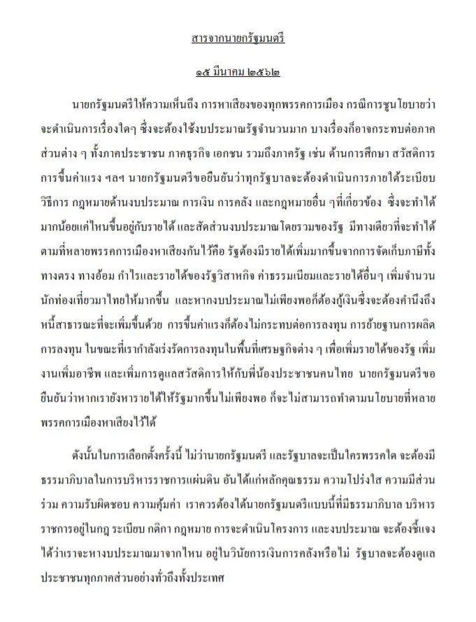 นายกรัฐมนตรี ได้ส่งสารจากนายกรัฐมนตรี ลงวันที่ 15 มี.ค. 2562 โดยมีใจความว่า นายกรัฐมนตรีให้ความเห็นถึงการหาเสียงของทุกพรรคการเมือง กรณีการชูนโยบายว่าจะดำเนินการเรื่องใดๆ ซึ่งจะต้องใช้งบประมาณรัฐจำนวนมากบางเรื่องก็อาจกระทบต่อภาคส่วนต่างๆ ทั้งภาคประชาชน ภาคธุรกิจ เอกชนรวมถึงภาครัฐ เช่น ด้านการศึกษา สวัสดิการและการขึ้นค่าแรง จึงขอยืนยันว่า ทุกรัฐบาลจะต้องดำเนินการภายใต้ระเบียบ วิธีการ กฎหมายด้านงบประมาณ การเงิน การคลังและกฎหมายอื่นๆ ที่เกี่ยวข้อง ซึ่งจะทำได้มากน้อยแค่ไหนขึ้นอยู่กับรายได้และสัดส่วนงบประมาณโดยรวมของรัฐ มีทางเดียวที่จะทำได้ตามที่หลายพรรคการเมืองหาเสียงกันไว้คือ รัฐต้องมีรายได้เพิ่มมากขึ้นจากการเก็บภาษีทั้งทางตรงทางอ้อม กำไรและรายได้ของรัฐวิสาหกิจ ค่าธรรมเนียมและรายได้อื่น ๆ เพิ่มจำนวนนักท่องเที่ยวมาไทยให้มากขึ้น และหากงบประมาณไม่เพียงพอก็ต้องกู้เงิน ซึ่งจะต้องคำนึงถึงหนี้สาธารณะที่เพิ่มขึ้นด้วย การขึ้นค่าแรงก็ต้องไม่กระทบต่อการลงทุน การย้ายฐาน การผลิต การลงทุน ในขณะที่เรากำลังเร่งรัดการลงทุนในพื้นที่เศรษฐกิจต่าง ๆ เพื่อเพิ่มรายได้ของรัฐ เพิ่มงาน เพิ่มอาชีพ และเพิ่มการดูแลสวัสดิการให้กับประชาชนคนไทย