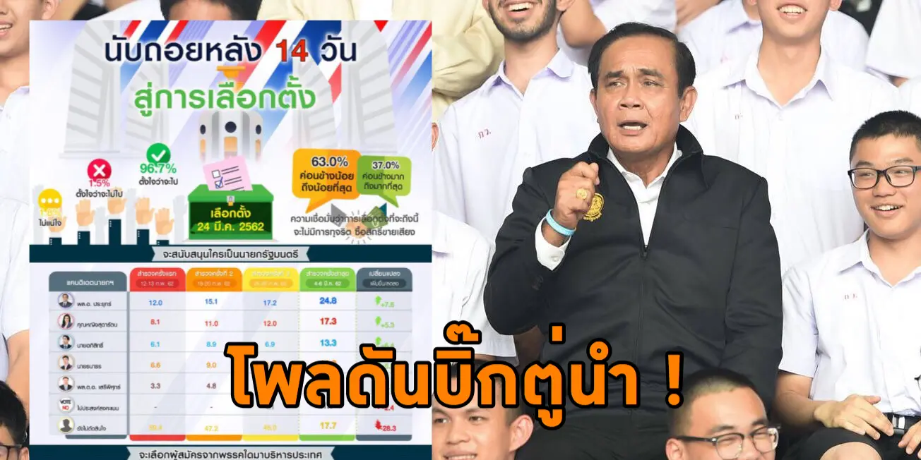 สุดท้ายเมื่อถามว่า “ในการเลือกตั้งครั้งนี้ ท่านจะสนับสนุนใครเป็นนายกรัฐมนตรี” พบว่า กลุ่มตัวอย่างร้อยละ 24.8 จะสนับสนุน พล.อ.ประยุทธ์ จันทร์โอชา (เพิ่มขึ้นร้อยละ 7.6) รองลงมาร้อยละ 17.3 จะสนับสนุน คุณหญิงสุดารัตน์ เกยุราพันธุ์ (เพิ่มขึ้นร้อยละ 5.3) ร้อยละ 13.3 จะสนับสนุน นายอภิสิทธ์ เวชชาชีวะ (เพิ่มขึ้นร้อยละ 6.4) ร้อยละ 11.3 จะสนับสนุน นายธนาธร จึงรุ่งเรืองกิจ (เพิ่มขึ้นร้อยละ 5.8) และร้อยละ 6.5 จะสนับสนุน พล.ต.อ.เสรีพิศุทธ์ เตมียาเวส (เพิ่มขึ้นร้อยละ 1.9) ขณะที่ร้อยละ 17.7 ยังไม่ตัดสินใจ (ลดลงร้อยละ 28.3)
