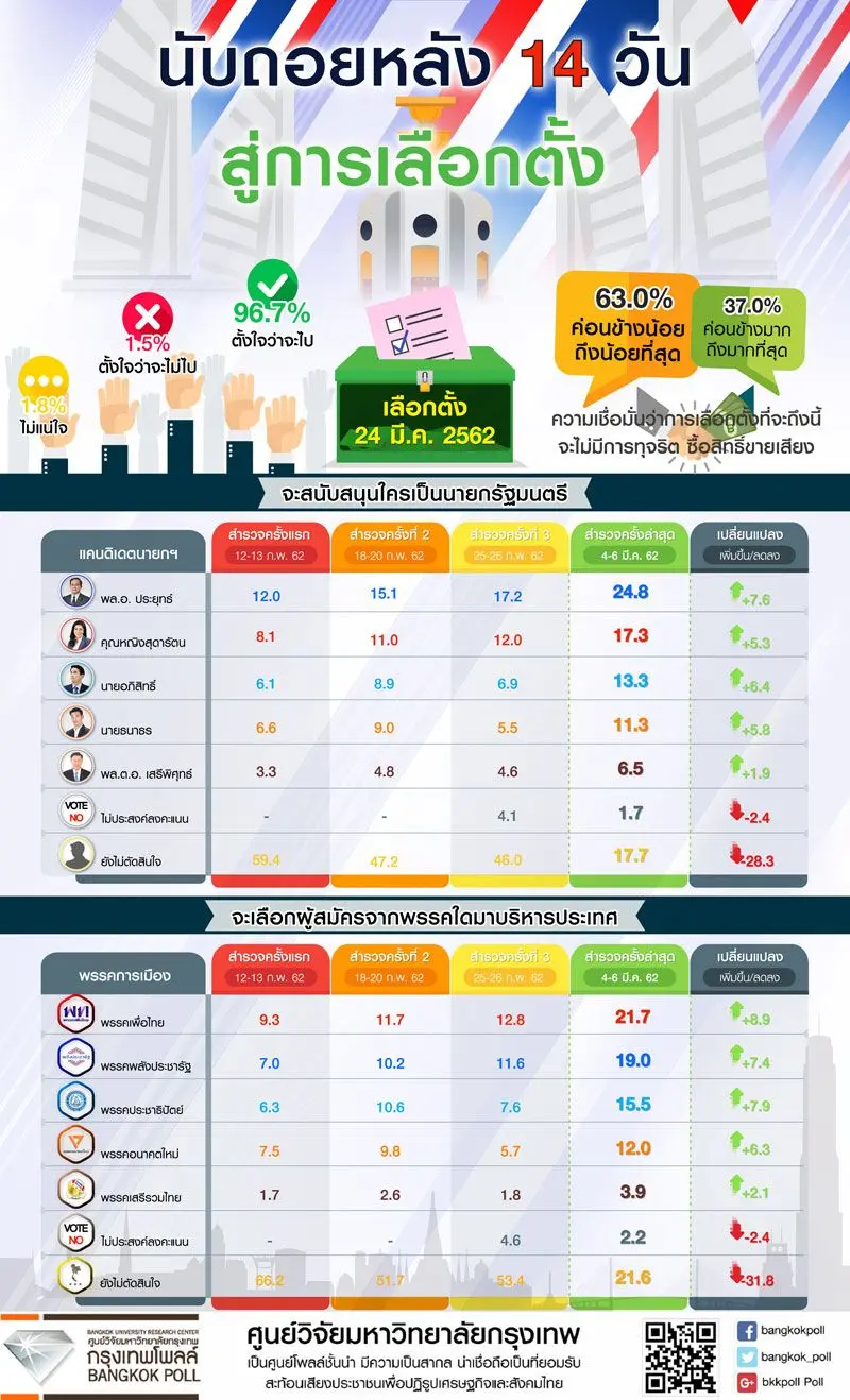 9 มี.ค.62-เนื่องในวันที่ 24 มีนาคม 2562 ที่จะถึงนี้เป็นวันเลือกตั้งสมาชิกสภาผู้แทนราษฎร (ส.ส.) กรุงเทพโพลโดยศูนย์วิจัยมหาวิทยาลัยกรุงเทพ จึงสำรวจความคิดเห็นประชาชน เรื่อง “นับถอยหลัง 14 วัน สู่การเลือกตั้ง” โดยเก็บข้อมูลกับประชาชนจากทุกภูมิภาคทั่วประเทศ จำนวน 1,735 คน พบว่าประชาชนส่วนใหญ่ร้อยละ 96.7 ตั้งใจว่าจะไปใช้สิทธิ์เลือกตั้ง ส.ส.ในวันที่ 24 มี.ค.62 ที่จะถึงนี้ ขณะที่ร้อยละ 1.5 ตั้งใจว่าจะไม่ไป ส่วนร้อยละ 1.8 ยังไม่แน่ใจ