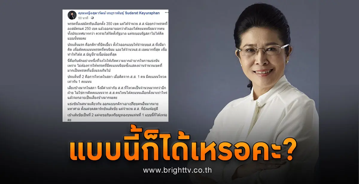 คุณหญิงสุดารัตน์ เกยุราพันธุ์ ส.ส. บัญชีรายชื่อและแคนดิเดตนายกรัฐมนตรี พรรคเพื่อไทย(พท.) โพสต์ข้อความผ่านเฟซบุ๊คส่วนตัวระบุถึงการเมืองในขณะนี้ข้อความว่า “พรรคที่ลงสมัครรับเลือกตั้ง 350 เขต แต่ได้จำนวน ส.ส.น้อยกว่าพรรคที่ลงสมัครแค่ 250 เขต แล้วออกมาบอกว่า ตัวเองได้คะแนนนิยมจากคนทั้งประเทศมากกว่า ควรจะได้จัดตั้งรัฐบาล แต่ระบอบรัฐสภาไม่ได้คิดแบบนั้นนะคะ