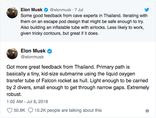 หลังจากที่ อีลอน มัสก์ ได้เสนอที่จะนำเอาเทคโนโลยีของบริษัท SpaceX , Boring Company มาช่วยในการนำเอาตัวทีมหมูป่าทั้ง 13 ชีวิตออกมาจากถ้ำหลวง โดยแนวความคิดหนึ่งที่ถูกนำมาเสนอนั่นก็คือการให้ทั้ง 13 คนนั้น เข้าไปอยู่ในยานชูชีพ คล้ายเรือดำน้ำขนาดพอดีตัว ที่สามารถลำเลียงคนได้ 1 คน ต่อ 1 ยาน และสามารถที่จะให้นักดำน้ำนั้นจูงไปได้
