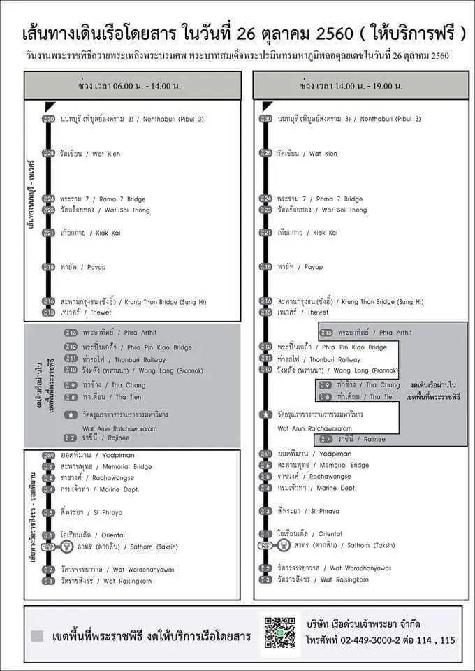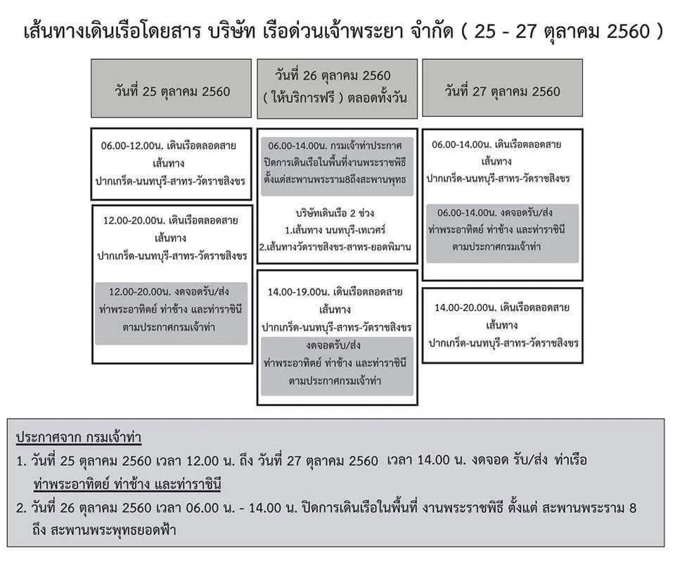 บริษัทเรือด่วนเจ้าพระยา จำกัด ขอแจ้งให้ทราบว่า ในวันที่ 26 ตุลาคม 2560 จะให้บริการเดินเรือโดยสาร โดยไม่เก็บค่าโดยสารตลอดทั้งวัน และจะเดินเรือตามคำสั่งของกรมเจ้าท่า ดังนี้
