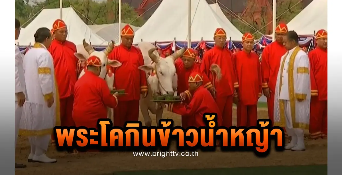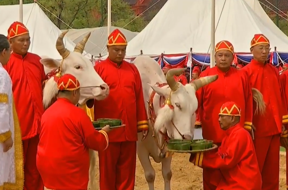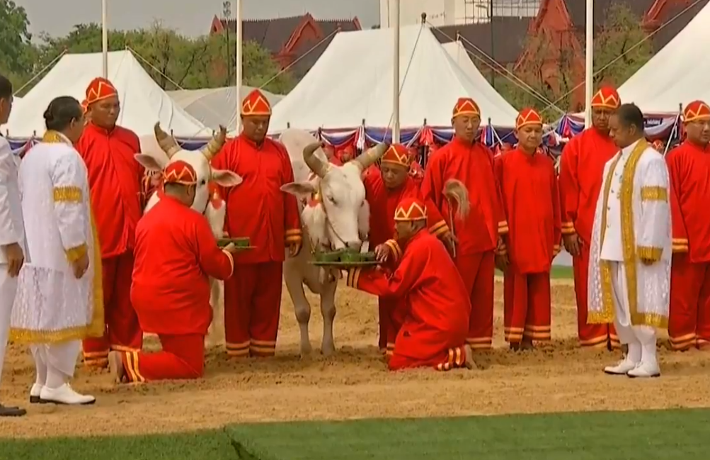 ในการนี้ ฤกษ์พิธีไถหว่าน ระหว่าง 08.29 -09.19 น. พราหมณ์ให้พระโคแรกนา ได้แก่ พระโคเพิ่มและพระโคพูล เสี่ยงทายของกิน 7 สิ่ง โดยปีนี้พระโคกินข้าว ทำนายว่า ธัญญาหาร ผลาหาร จะบริบูรณ์ดี พระโคกิน น้ำ หญ้า ทำนายว่า น้ำท่าจะบริบูรณ์พอสมควร ธัญญาหาร ผลาหาร ภักษาหาร มังสาหาร จะอุดมสมบูรณ์