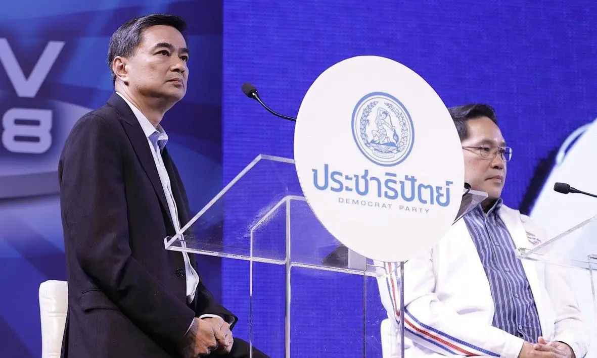 : อภิสิทธิ์ เวชชาชีวะ หัวหน้าพรรคประชาธิปัตย์ กับอุตตม สาวนายน หัวหน้าพรรคพลังประชารัฐ