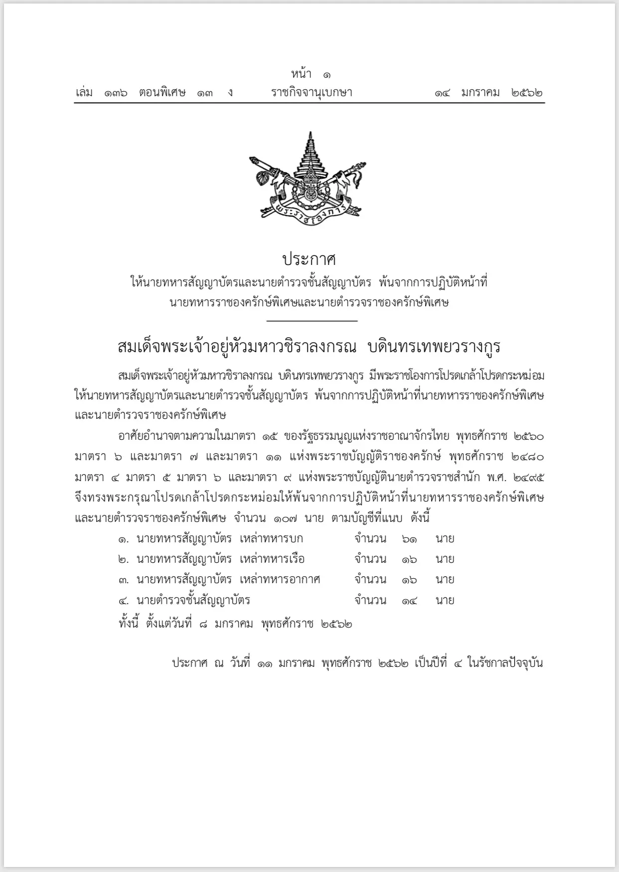 14 ม.ค.62-เว็บไซต์ราชกิจจานุเบกษา ได้เผยแพร่ประกาศให้นายทหารสัญญาบัตรและนายตำรวจชั้นสัญญาบัตร พ้นจากการปฏิบัติหน้าที่นายทหารราชองครักษ์พิเศษและนายตำรวจราชองครักษ์พิเศษ ความว่า สมเด็จพระเจ้าอยู่หัวมหาวชิราลงกรณ บดินทรเทพยวรางกูร มีพระราชโองการโปรดเกล้าโปรดกระหม่อม  ให้นายทหารสัญญาบัตรและนายตำรวจชั้นสัญญาบัตร พ้นจากการปฏิบัติหน้าที่นายทหารราชองครักษ์พิเศษและนายตำรวจราชองครักษ์พิเศษ อาศัยอำนาจตามความในมาตรา ๑๕ ของรัฐธรรมนูญแห่งราชอาณาจักรไทย พุทธศักราช ๒๕๖๐ มาตรา ๖ และมาตรา ๗ และมาตรา ๑๑ แห่งพระราชบัญญัติราชองครักษ์ พุทธศักราช ๒๔๘๐ มาตรา ๔ มาตรา ๕ มาตรา ๖ และมาตรา ๙ แห่งพระราชบัญญัตินายตำรวจราชสำนัก พ.ศ. ๒๔๙๕ จึงทรงพระกรุณาโปรดเกล้าโปรดกระหม่อมให้พ้นจากการปฏิบัติหน้าที่นายทหารราชองครักษ์พิเศษ และนายตำรวจราชองครักษ์พิเศษ จำนวน ๑๐๗ นาย ตามบัญชีที่แนบ ดังนี้