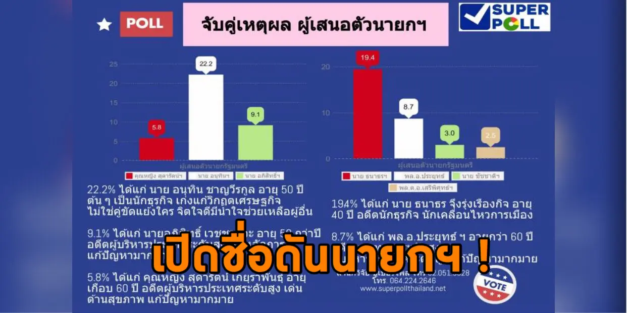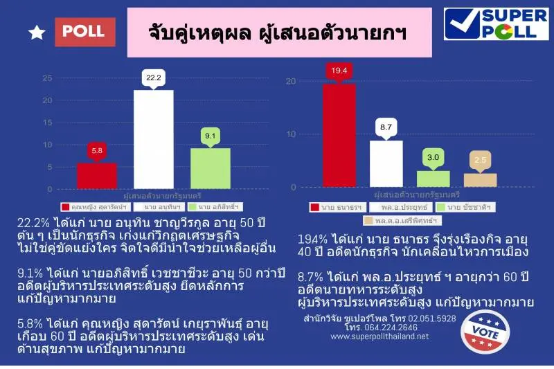 ที่น่าสนใจคือ การจับคู่เหตุผล ตัวตน ผู้เสนอตัวเป็นนายกรัฐมนตรี พบว่า อันดับแรก หรือร้อยละ 22.2 ได้แก่ นาย อนุทิน ชาญวีรกูล อายุ 50 ต้น ๆ เป็นนักธุรกิจ เคยเป็นผู้บริหารประเทศระดับสูง เก่งแก้ปัญหาวิกฤตเศรษฐกิจ ไม่ใช่คู่ขัดแย้งของใคร จิตใจดีมีน้ำใจช่วยเหลือผู้อื่น รองลงมาคือ ร้อยละ 19.4 ได้แก่ นาย ธนาธร จึงรุ่งเรืองกิจ อายุประมาณ 40 ปี อดีตนักธุรกิจ เป็นนักเคลื่อนไหวทางการเมือง ฯลฯ ร้อยละ 9.1 ได้แก่ นายอภิสิทธิ์ เวชชาชีวะ อายุ 50 กว่าปี อดีตผู้บริหารประเทศระดับสูง ยึดหลักการ แก้ปัญหามากมาย