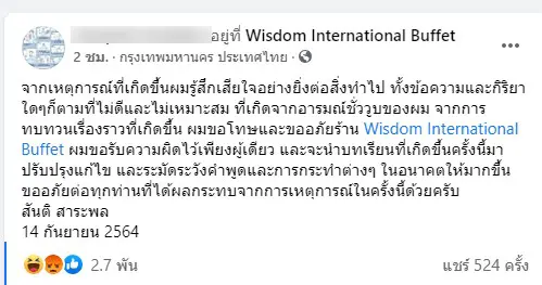 จากเหตุการณ์ที่เกิดขึ้นผมรู้สึกเสียใจอย่างยิ่งต่อสิ่งทำไป ทั้งข้อความและกิริยาใดๆก็ตามที่ไม่ดีและไม่เหมาะสม ที่เกิดจากอารมณ์ชั่ววูบของผม จากการทบทวนเรื่องราวที่เกิดขึ้น ผมขอโทษและขออภัยร้าน Wisdom International Buffet ผมขอรับความผิดไว้เพียงผู้เดียว และจะนำบทเรียนที่เกิดขึ้นครั้งนี้มาปรับปรุงแก้ไข และระมัดระวังคำพูดและการกระทำต่างๆ ในอนาคตให้มากขึ้น ขออภัยต่อทุกท่านที่ได้ผลกระทบจากการเหตุการณ์ในครั้งนี้ด้วยครับ