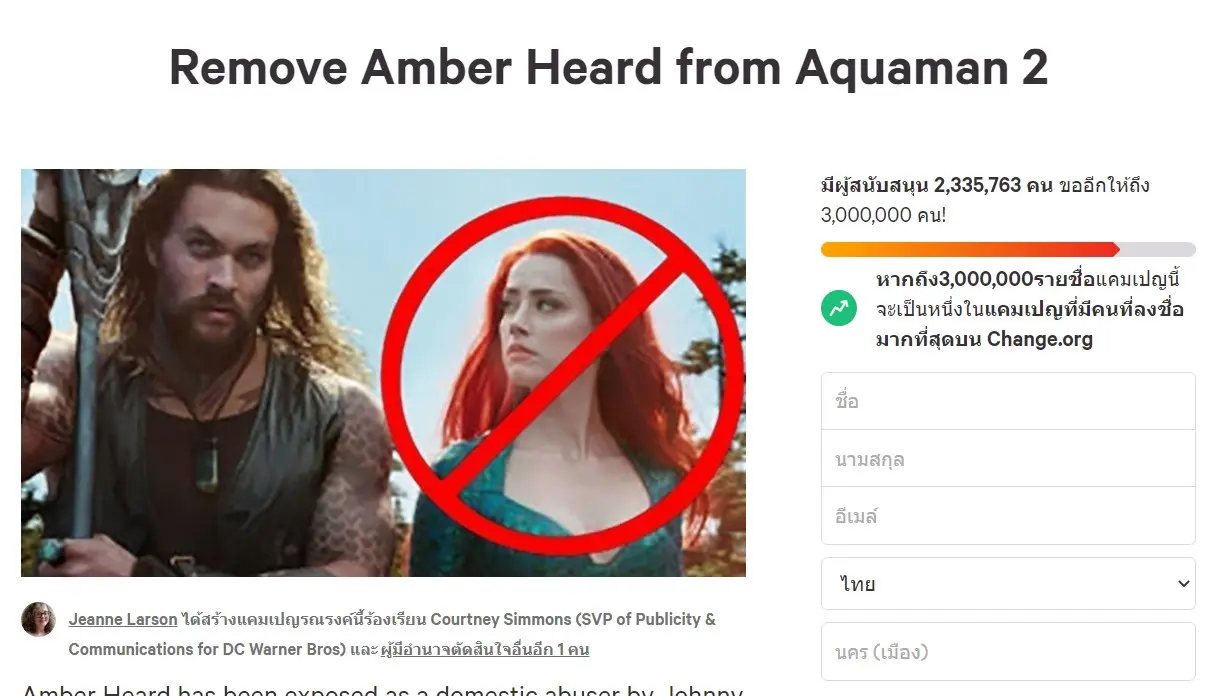 หากใครติดตามข่าวสารในแวดวงฮอลลีวูด ก็คงจะรู้ว่าในช่วงหลายเดือนที่ผ่านมาจนมาถึงตอนนี้ กำลังมีการไตร่สวนในคดีฟ้องร้องสุดอื้อฉาวระดับโลก ซึ่งผลพวงจากเรื่องราวดังกล่าวได้สร้างผลกระทบให้กับทั้งคู่ ซึ่งด้าน Johnny Depp เองก็โดนปลดสายฟ้าแลบจากบทบาทสำคัญต่างๆไม่ว่าจะเป็น Captain Jack Sparrow หรือ Grindelwald มาตั้งแต่ยังไม่เป็นคดีความ เป็นเพียงคำกล่าวอ้างของ อดีตภรรยา Amber Heard เท่านั้น ส่วนทาง Amber ก็มีผลกระทบ(บ้าง)หลังจากได้มีการเรียกร้องให้ถอดเธอออกจากบทบาท Mera ใน Aquaman and the Lost Kingdom โดยได้มีการล่ารายชื่อของชาวเน็ตในเว็บไซต์ Change.org ล่าสุดมีคนลงชื่อไปแล้วกว่า 2,335,771 คน