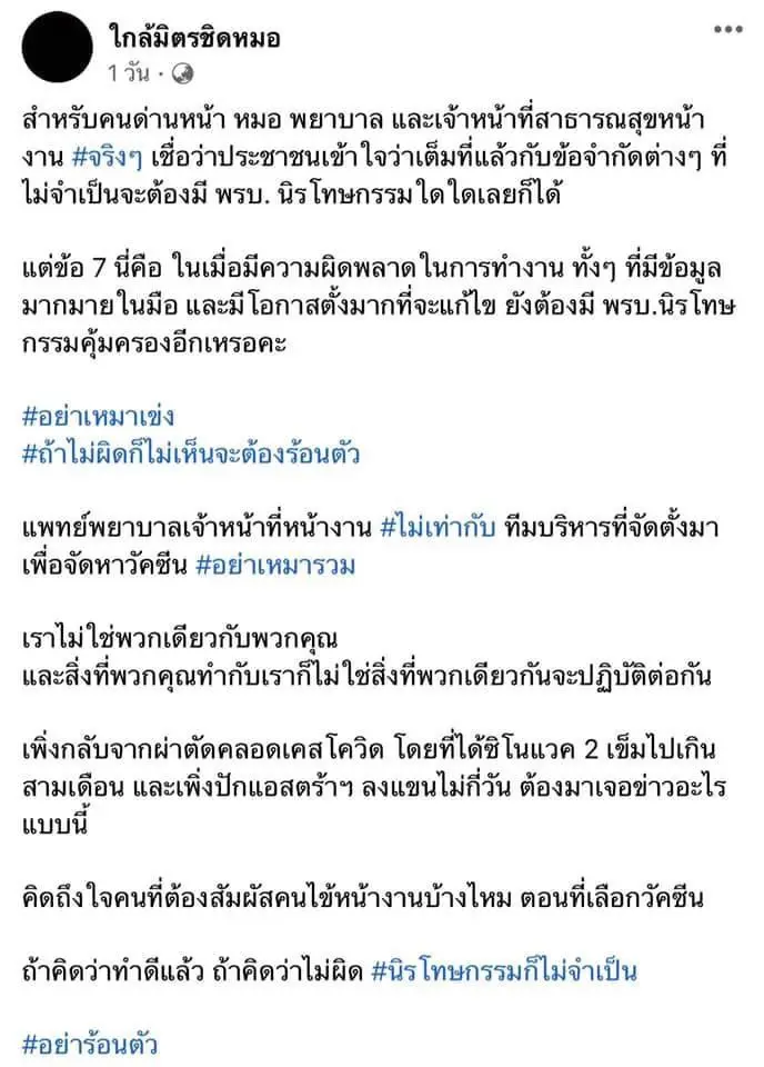 ทำให้เพจ ใกล้มิตรชิดหมอ ออกมาโพสต์ระบาย โดยเจ้าของเพจได้ระบุว่า ไม่จำเป็นจะต้องมี พรก. นิรโทษกรรมใดใดเลย เพราะฉะนั้นอย่าเหมาเข่ง ถ้าไม่ผิดก็ไม่เห็นจะต้องร้อนตัว แพทย์พยาบาลเจ้าหน้าที่หน้างาน ไม่เท่ากับ ทีมบริหารที่จัดตั้งมาเพื่อจัดหาวัคซีน อย่าเหมารวม