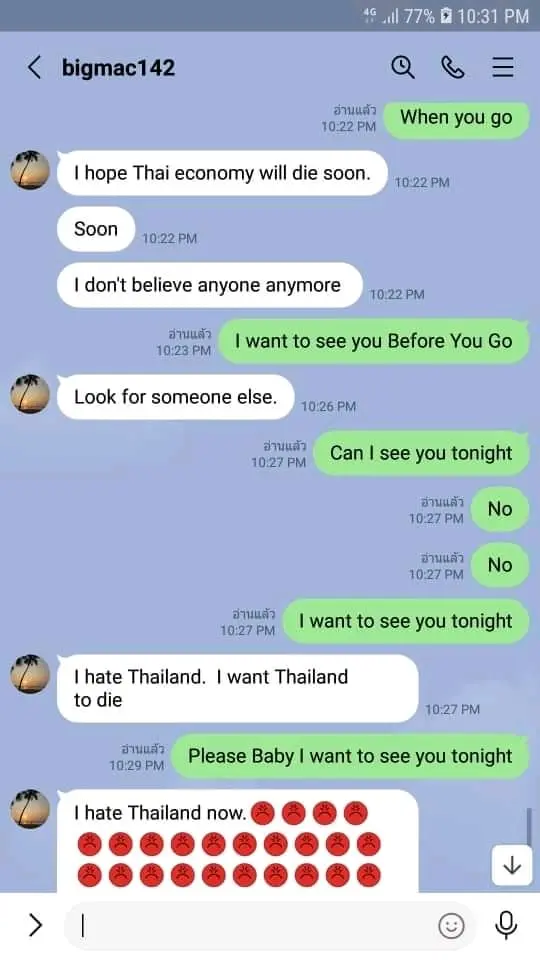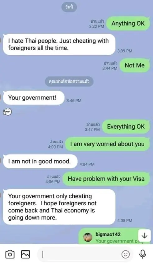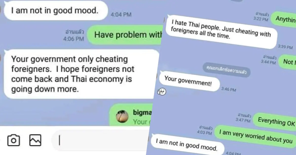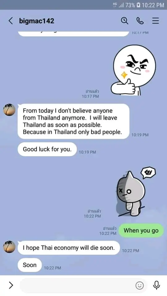 จึงได้ไปเล่าให้เพื่อนชาวไทยฟังด้วยความโมโหซึ่งในการสนทนา นักท่องเที่ยวรายนี้ได้ระบุว่า เกลียดชาวไทย เกลียดรัฐบาลไทย คนไทยขี้โกง โดนปรับเงินทั้งๆที่ไม่ใช่ความผิดของตน รัฐบาลไทยขี้โกง เอาเปรียบชาวต่างชาติอยู่เสมอ และขอให้ชาวต่างชาติไม่มาเที่ยวไทยอีก ให้เศรษฐกิจไทยล่มจมไปเลย หลังจากวันนี้จะไม่เชื่อใจคนไทยอีกแล้ว ประเทศไทยมีแต่คนเลว และจะรีบออกจากไทยให้เร็วที่สุด