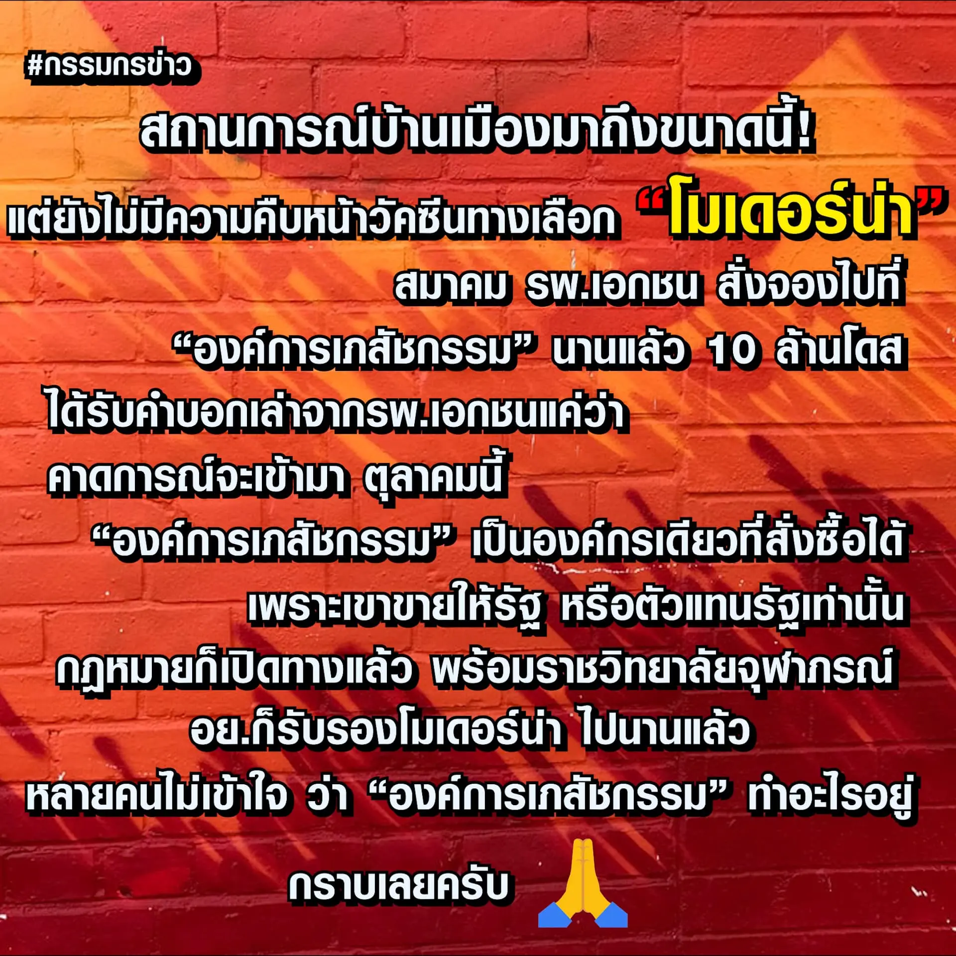 สมาคม รพ.เอกชน สั่งจองไปที่ “องค์การเภสัชกรรม” นานแล้ว 10 ล้านโดส ได้รับคำบอกเล่าจากรพ.เอกชน แค่ว่า คาดการณ์จะเข้ามาตุลาคมนี้ “องค์การเภสัชกรรม” เป็นองค์กรเดียวที่สั่งซื้อได้ เพราะเขาขายให้รัฐ หรือตัวแทนรัฐเท่านั้น กฎหมายก็เปิดทางแล้วพร้อมราชวิทยาลัยจุฬาภรณ์ อย.ก็รับรอง โมเดอร์น่า ไปนานแล้ว หลายคนไม่เข้าใจว่า “องค์การเภสัชกรรม” ทำอะไรอยู่ กราบเลยครับ