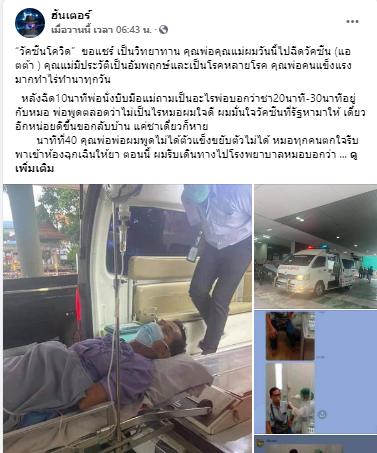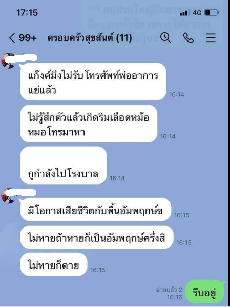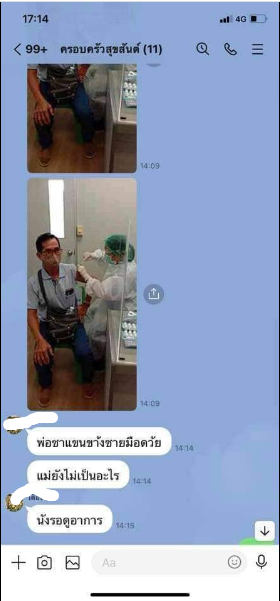 ตอนนี้ ผมรีบเดินทางไปโรงพยาบาลหมอบอกว่า เกิดริ่มเลือด มีโอกาสเสียชีวิตหรือฟื้นขึ้นมาเป็นอัมพาต ผมห่วงพ่อมาก พ่อพูดตลอดว่าอยากฉีดวัคซีนรอวันฉีดให้ผมจองคิวในหมอชนะให้ ผมบอกว่าอายุ60แล้วห่วงอย่าฉีดเลยข่าวฉีดและมีผลข้างเคียงเยอะ พ่อก็พูดเสมอว่า มั่นใจวัคซีนของรัฐ มั่นใจหมออยู่กับหมอ