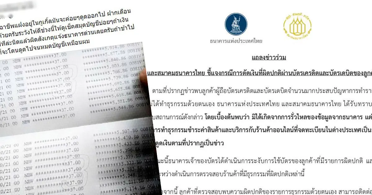 ตามที่ปรากฏข่าวพบลูกค้าผู้ถือบัตรเครดิตและบัตรเดบิตจำนวนมากประสบปัญหาการทำรายการชำระเงินโดยที่ไม่ได้ทำธุรกรรมด้วยตนเอง แบงก์ชาติและสมาคมธนาคารไทย ได้รับทราบปัญหาและได้ตรวจสอบสถานการณ์ดังกล่าว โดยเบื้องต้นพบว่า มิได้เกิดจากการรั่วไหลของข้อมูลจากธนาคาร แต่เป็นรายการที่เกิดจากการทำธุรกรรมชำระค่าสินค้าและบริการกับร้านค้าออนไลน์ที่จดทะเบียนในต่างประเทศเป็นส่วนใหญ่ และไม่ใช่แอปดูดเงินตามที่ปรากฏเป็นข่าว