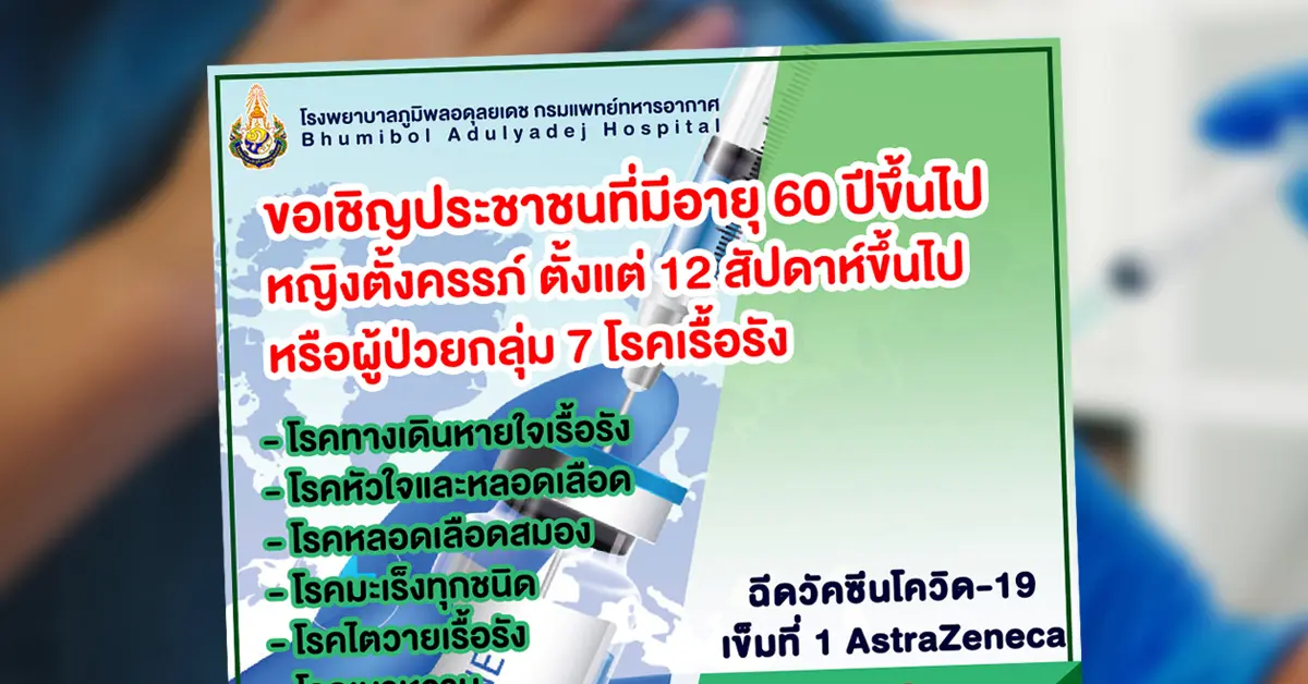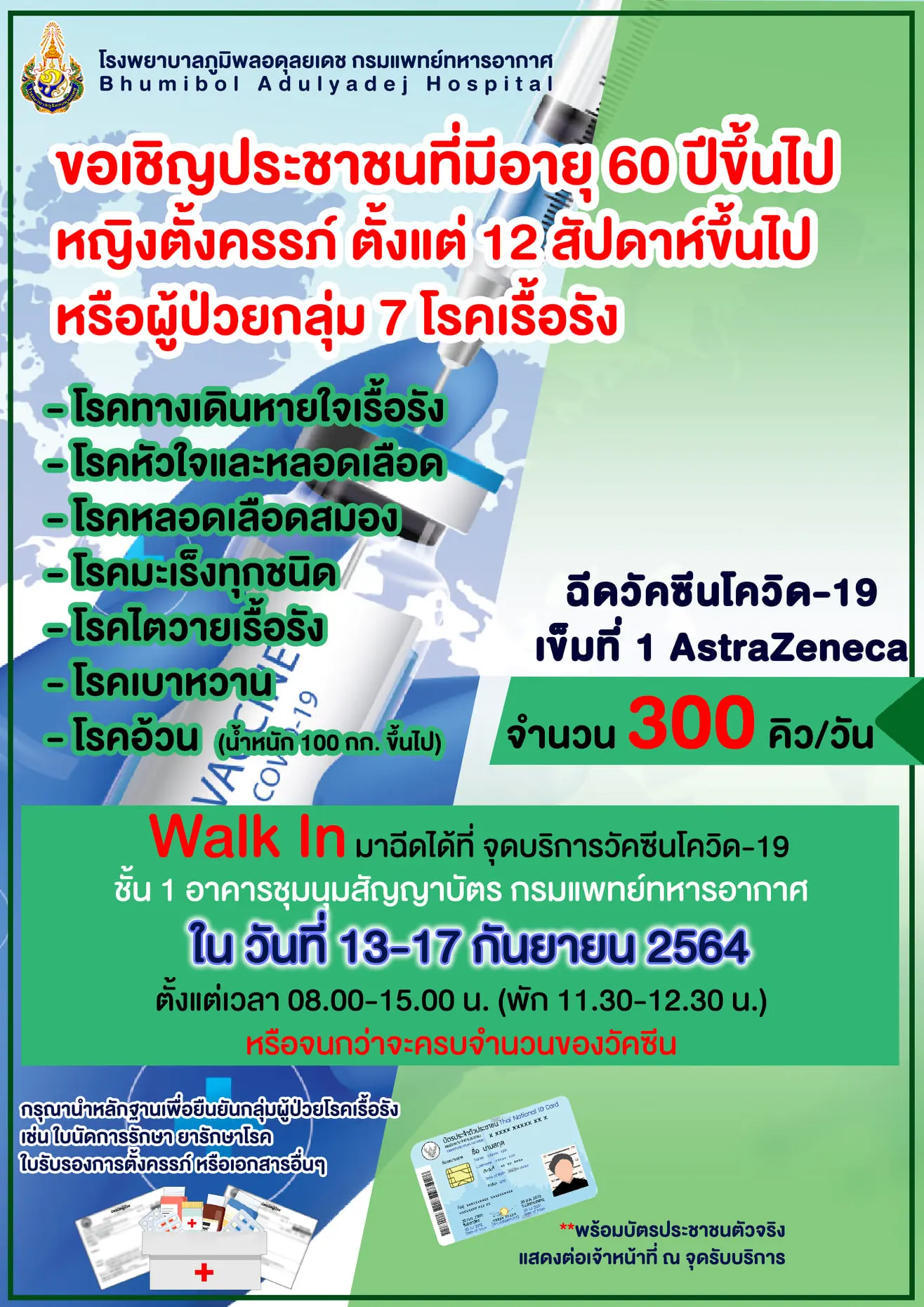 โรงพยาบาลภูมิพล ออกประกาศเชิญชวนประชาชนที่กลุ่มเสี่ยง วอล์คอินเข้ารับวัคซีน แอสตร้าเซเนก้า (AstraZeneca) เป็นเข็มที่ 1 โดยรับวันละ 300 คิวเท่านั้น