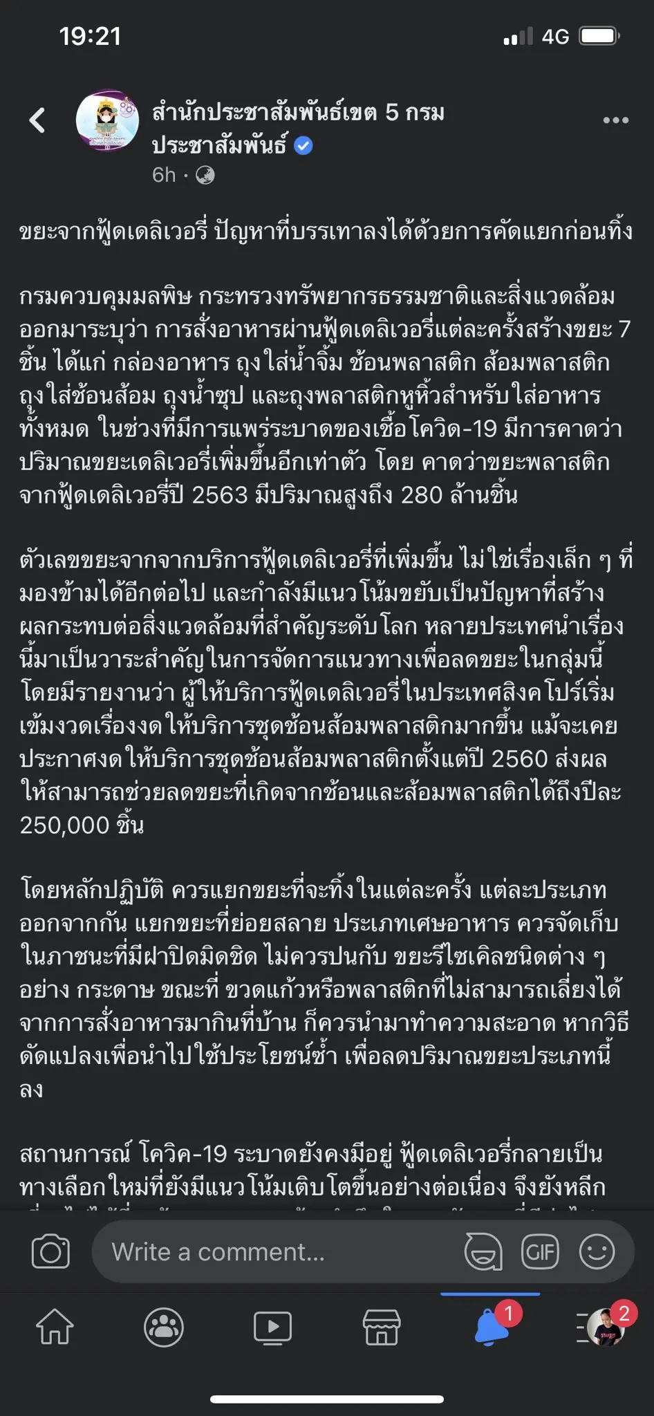 ส่งผลให้สำนักงาน ร้านค้า สินค้าและบริการบางอย่างจำเป็นที่จะต้องหยุดกิจการลงชั่วคราว เหลือบริการเฉพาะที่จำเป็นต่อชีวิตประจำวัน ตามมาตรการรักษาระยะห่างทางสังคม ลดจุดเสี่ยงติดเชื้อลง ฟู้ดเดลิเวอรี่กลายเป็นทางเลือกใหม่ที่มีแนวโน้มเติบโตขึ้นอย่างต่อเนื่อง จึงยิ่งหลีกเลี่ยงไม่ได้ที่จะต้องพยายามสร้างการมีส่วนร่วมในการจัดการขยะที่ดีต่อไป เพียงเท่านั้นทางแอดมินเพจ ขอขอบคุณทุกท่านรวมถึงความคิดเห็นที่สะท้อนทางสื่อออนไลน์ทั้งหมดเป็นอย่างสูง ที่ทำให้ทราบถึงความรู้สึกของสังคมขณะนี้ขออภัยเป็นอย่างยิ่งอีกครั้ง