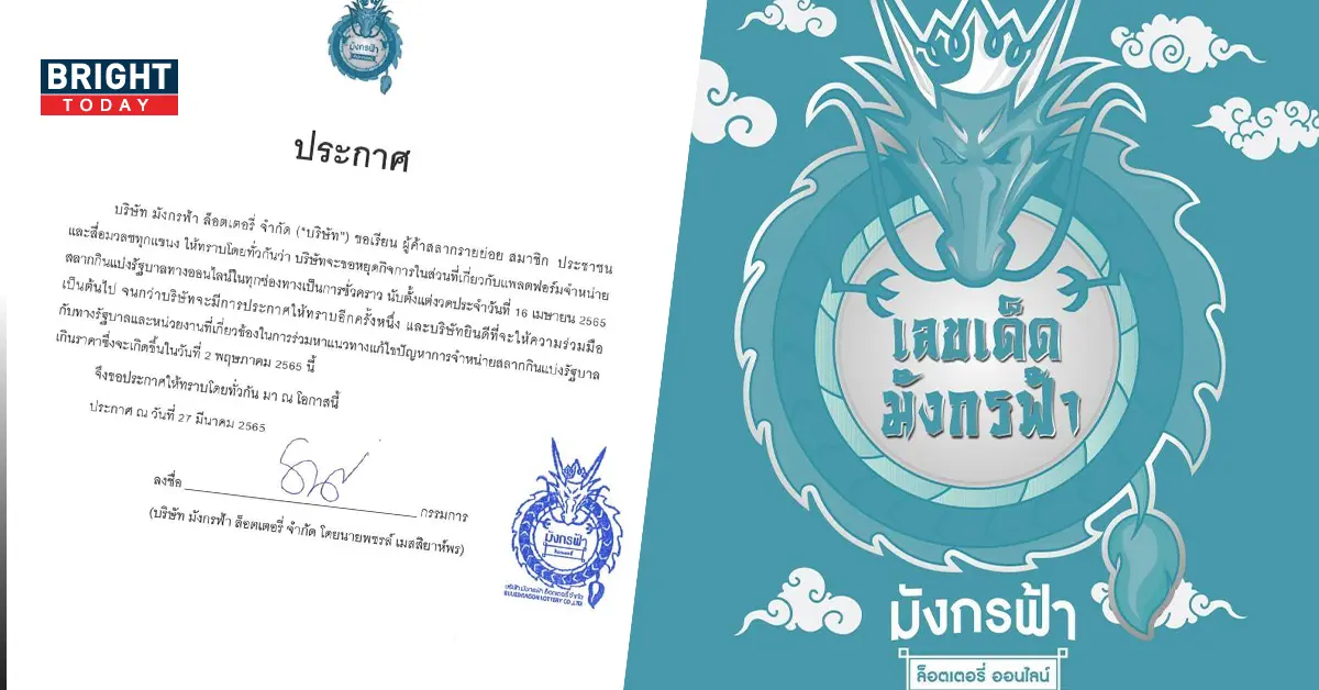 มังกรฟ้า ประกาศยุติกิจการ แพลตฟอร์มขายสลากกินแบ่งรัฐบาลทางออนไลน์ ชั่วคราว เริ่ม เผยให้ความร่วมมือกับทางรัฐบาลแก้ไขปัญหาการจำหน่ายสลากกินแบ่งรัฐบาลเกินราคา