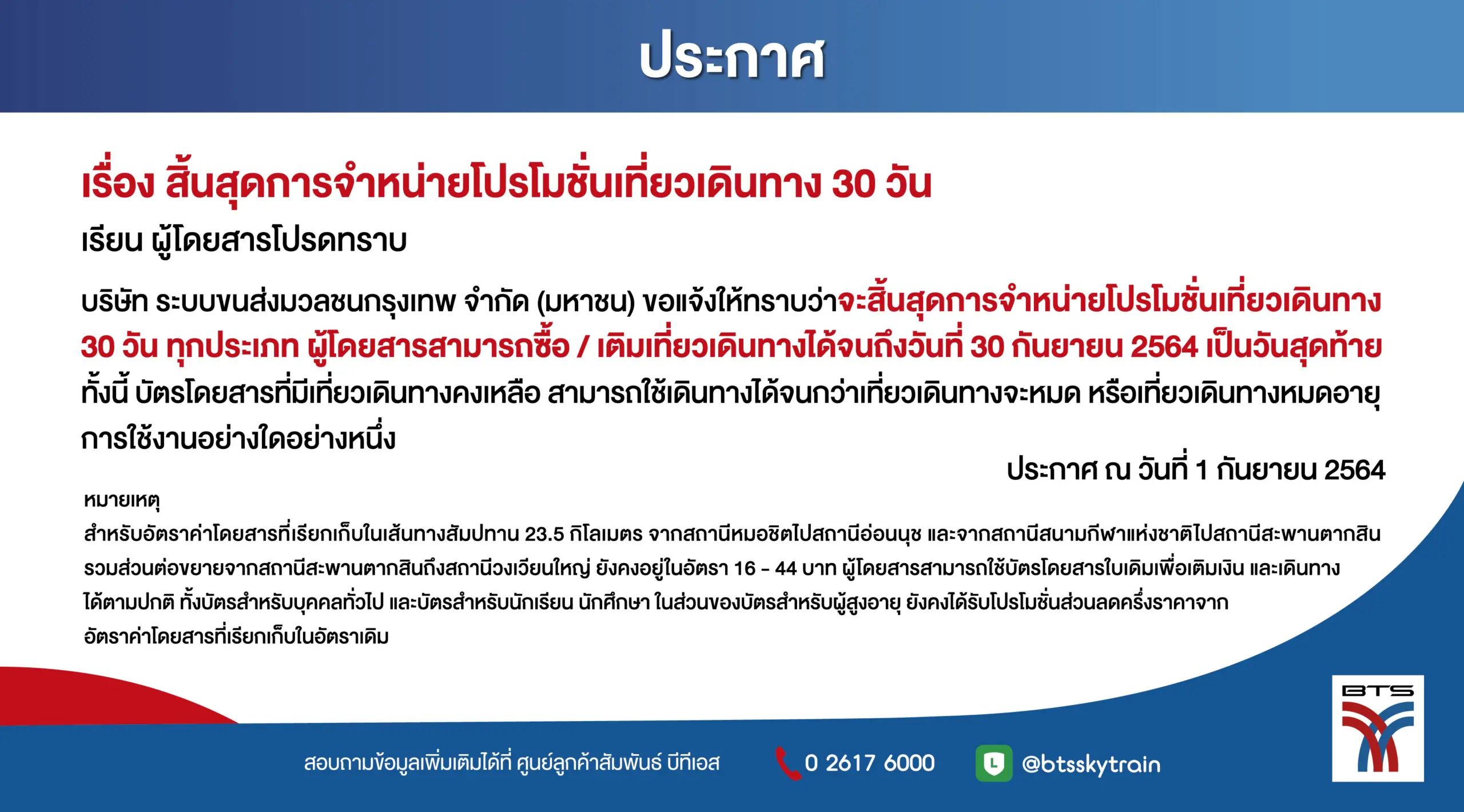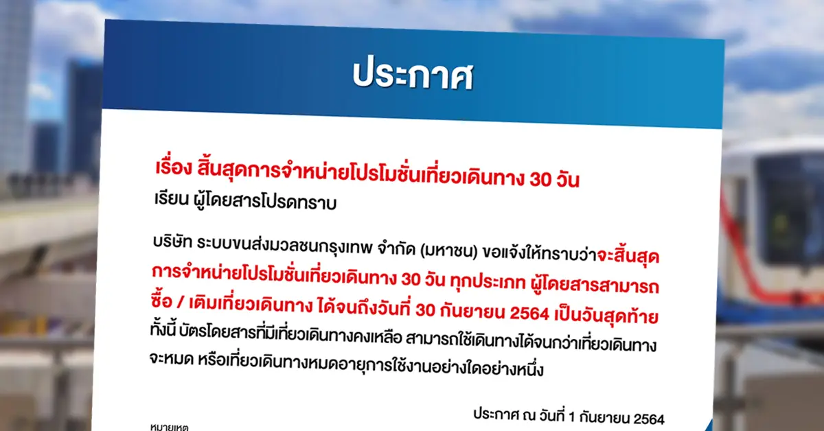 วันนี้ 1 กันยายน 2564 บริษัทขนส่งมวลชนกรุงเทพ จำกัด (มหาชน) หรือ รถไฟฟ้าบีทีเอส ได้ออกประกาศแจ้ง แก่ผู้โดยสารบีทีเอส เรื่อง สิ้นสุดโปรโมชั่นเที่ยวเดินทาง 30 วัน โดยมีเนื้อหาดังนี้