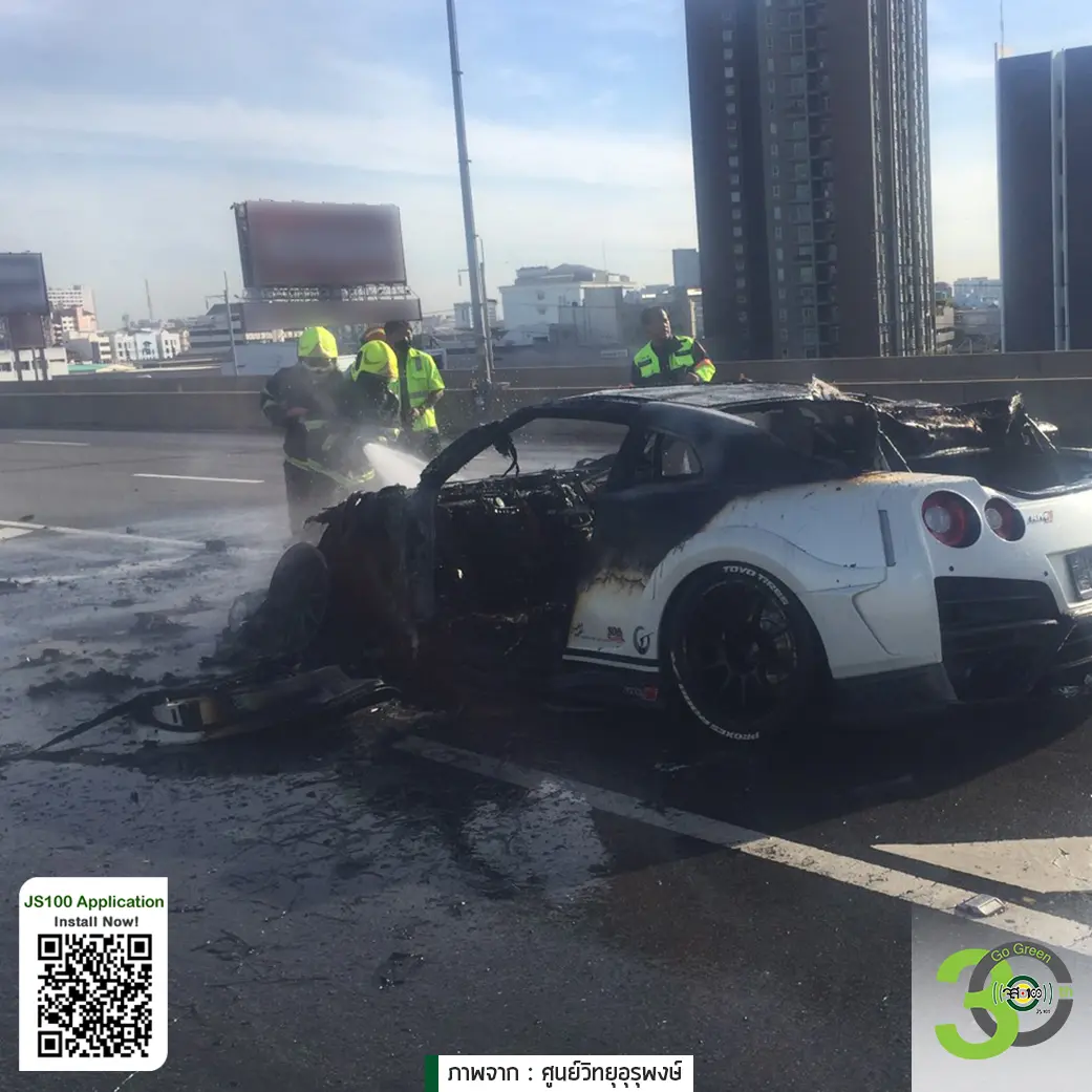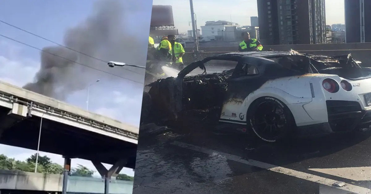 สาวกรถซิ่งร้องซี้ด Nissan GT-R ไฟไหม้ วอดทั้งคัน บนโทลล์เวย์ เบื้องต้นไม่มีผู้บาดเจ็บ