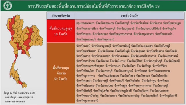 - กรุงเทพมหานคร เชียงใหม่ ชลบุรี สมุทรปราการ ประจวบคีรีขันธ์ สมุทรสาคร ปทุมธานี นครปฐม ภูเก็ต นครราชสีมา นนทบุรี สงขลา ตาก อุดรธานี สุพรรณบุรี สระแก้ว ระยอง และขอนแก่น (พื้นที่สีแดง) ส่วนพื้นที่เหลือ 59 จังหวัดเป็นพื้นที่ควบคุม (สีส้ม)