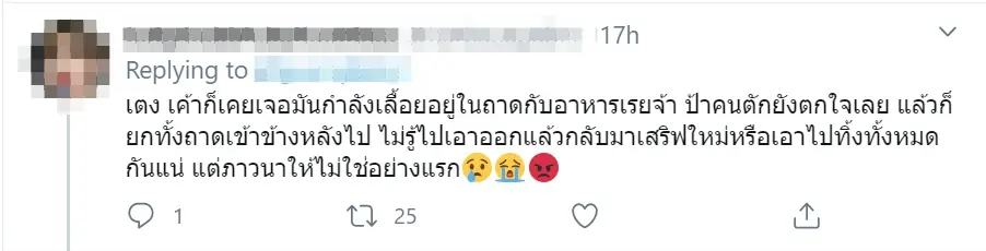 นอกจากนี้ยังมีผู้ใช้ทวิตเตอร์อีกรายที่เคยเจอประสบการณ์เดียวกัน ระบุว่า “เตง เค้าก็เคยเจอมันกำลังเลื้อยอยู่ในถาดกับอาหารเรยจ้า ป้าคนตักยังตกใจเลย แล้วก็ยกทั้งถาดเข้าข้างหลังไป ไม่รู้ไปเอาออกแล้วกลับมาเสริฟใหม่หรือเอาไปทิ้งทั้งหมดกันแน่ แต่ภาวนาให้ไม่ใช่อย่างแรก”