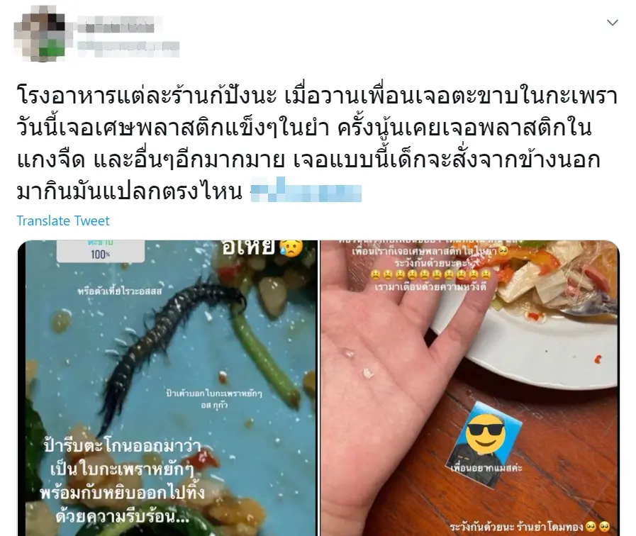ผู้ใช้ทวิตเตอร์รายหนึ่งโพสต์ภาพและข้อความเตือนภัย ระบุว่า “โรงอาหารแต่ละร้านก็ปังนะ เมื่อวานเพื่อนเจอตะขาบในกะเพรา วันนี้เจอเศษพลาสติกแข็งๆในยำ ครั้งนู้นเคยเจอพลาสติกในแกงจืด และอื่นๆอีกมากมาย เจอแบบนี้เด็กจะสั่งจากข้างนอกมากินมันแปลกตรงไหน”