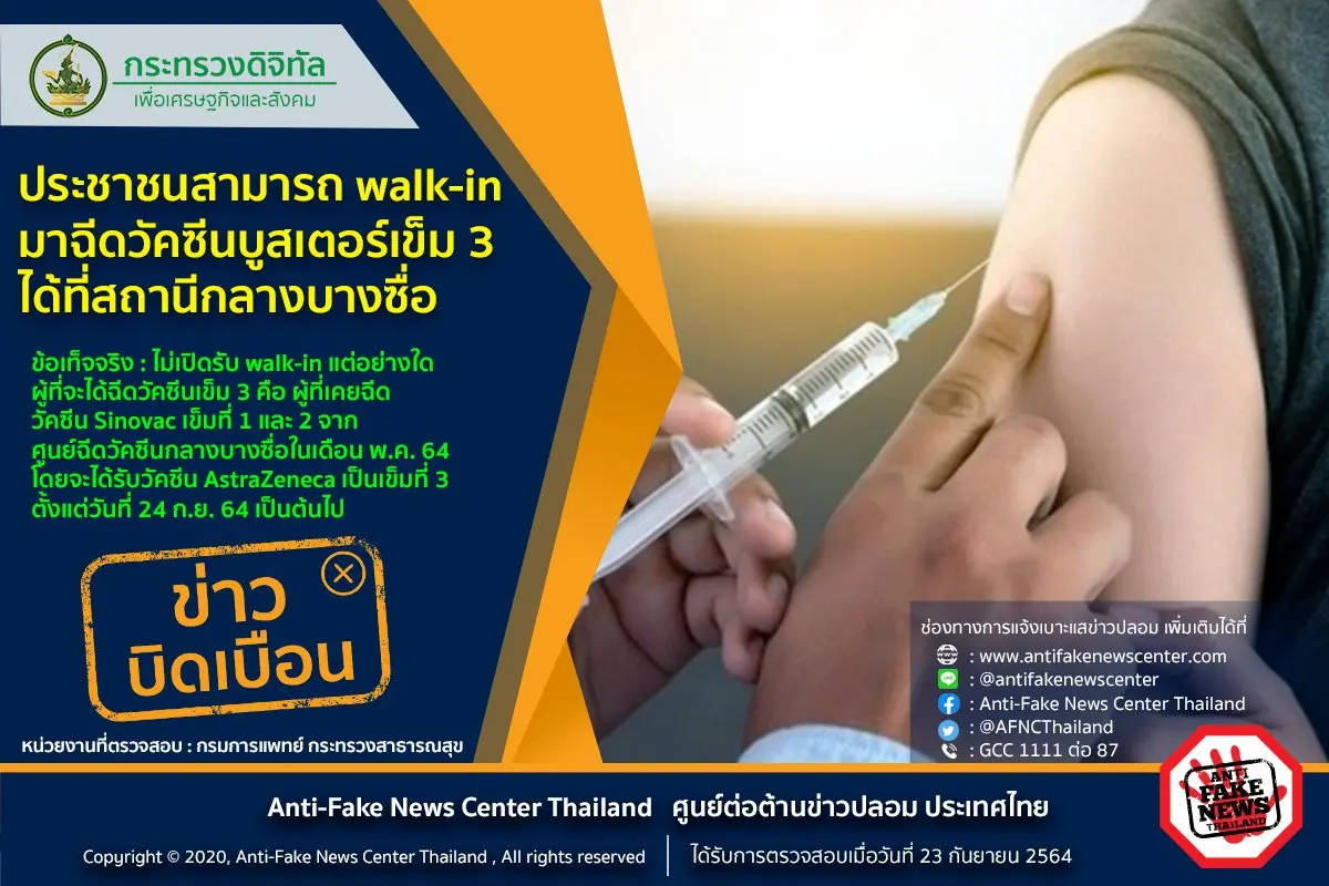 กรณีการเผยแพร่ข้อมูลเกี่ยวกับการฉีดวัคซีนว่า ในวันที่ 24 ก.ย. 64 ประชาชนสามารถ walk-in มาฉีดวัคซีนเข็มที่ 3 ได้ที่สถานีกลางบางซื่อนั้น ทางกรมการแพทย์ กระทรวงสาธารณสุข ได้ชี้แจงข้อเท็จจริงว่า การให้บริการวัคซีนเข็มกระตุ้น (Booster dose) กลุ่มเป้าหมาย เป็นผู้ที่เคยได้รับวัคซีน Sinovac เข็มที่ 1 และ 2 (สูตร SS) จากศูนย์ฉีดวัคซีนกลางบางซื่อ ในเดือนพฤษภาคม 2564 โดยจะได้รับวัคซีน AstraZeneca เป็นเข็มกระตุ้น (เข็มที่ 3) ตั้งแต่วันที่ 24 กันยายน 2564 เป็นต้นไป