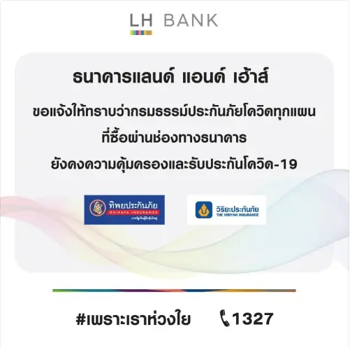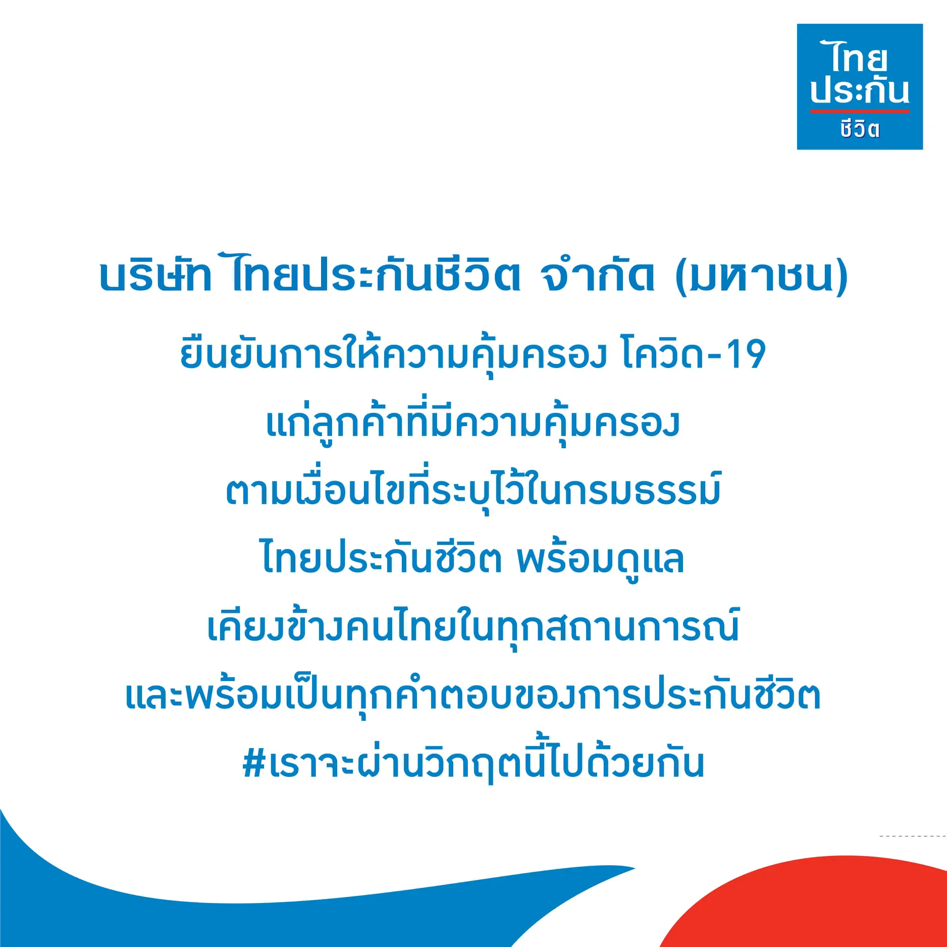 บริษัท ไทยประกันชีวิต จำกัด (มหาชน) ยืนยันการให้ความคุ้มครองโควิด-19 แก่ลูกค้าที่มีความคุ้มครอง ตามเงื่อนไขที่ระบุไว้ในกรมธรรม์ ไทยประกันชีวิต พร้อมดูแล เคียงข้างคนไทยในทุกสถานการณ์ และพร้อมเป็น #ทุกคำตอบของการประกันชีวิต