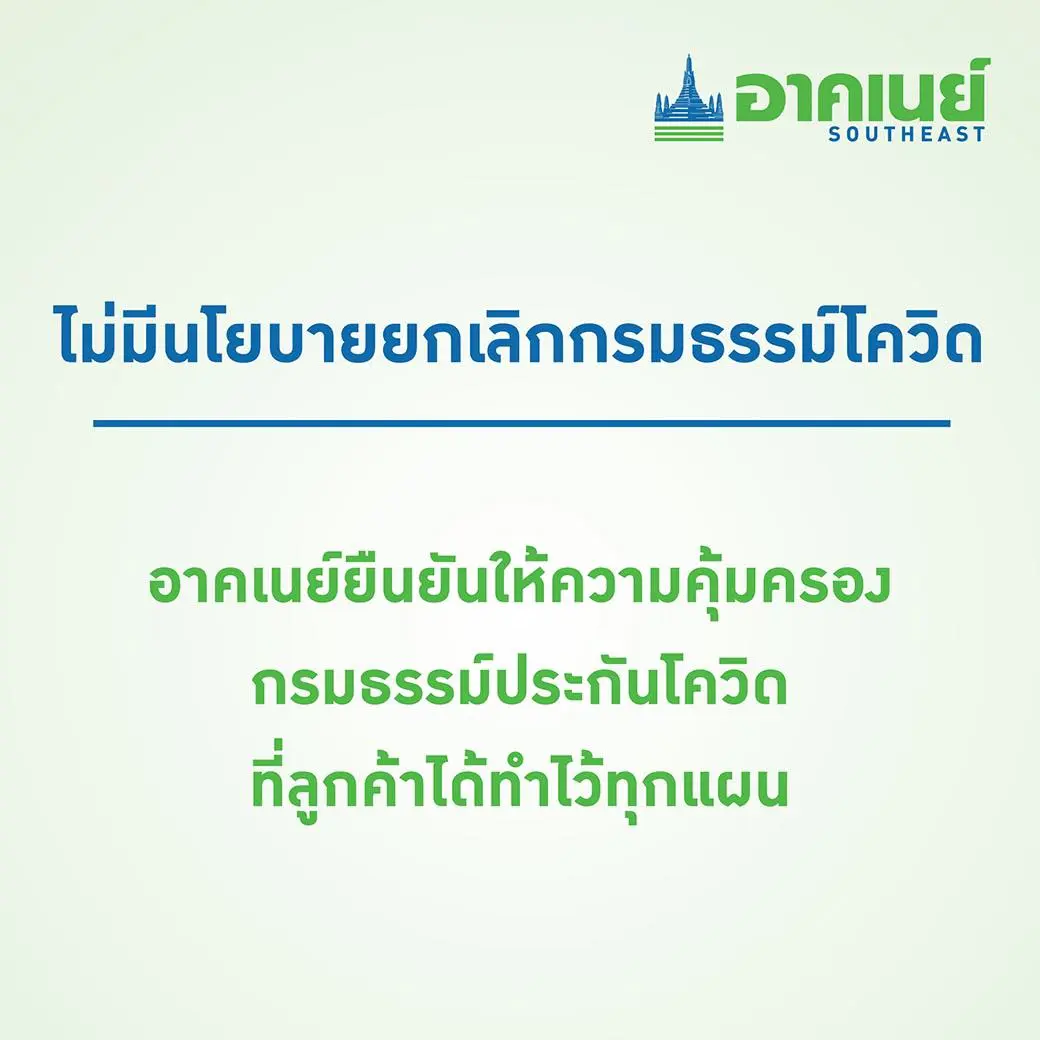 อาคเนย์ขอขอบพระคุณลูกค้าทุกท่านที่ไว้วางใจให้เราดูแล ในสถานการณ์ที่ยากลำบากเช่นนี้ เราขอยืนยันว่าจะดูแลลูกค้าทุกท่านที่ซื้อประกัน COVID-19 ทุกแผนจากเรา ดังนั้นขอให้ท่านมั่นใจว่าจะได้รับความคุ้มครองตามเงื่อนไขของกรมธรรม์ที่ท่านถืออยู่