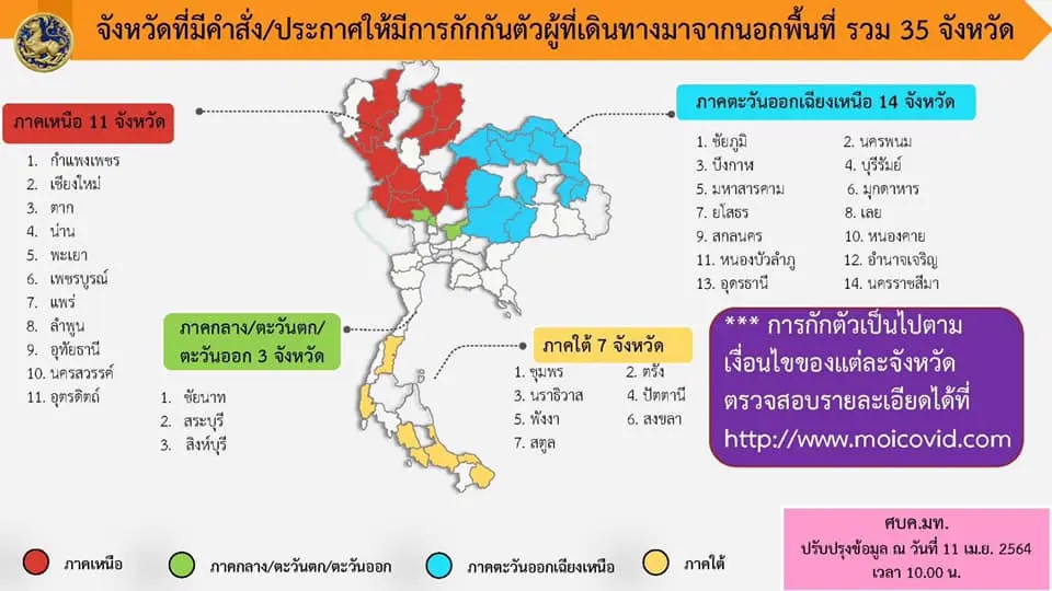 จังหวัดที่ต้องกักตัว – จังหวัดที่มีคำสั่ง/ประกาศให้มีการกักกันตัวผู้ที่เดินทางมาจากนอกพื้นที่ รวม 35 จังหวัด (ข้อมูล ณ วันที่ 11 เม.ย.64 เวลา 10.00 น.)