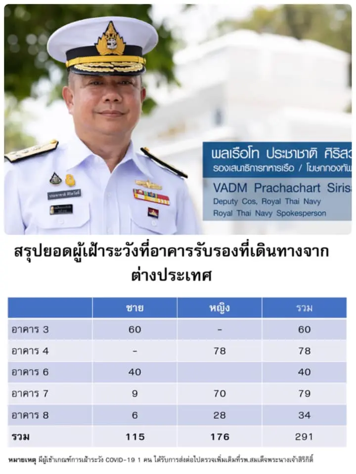 พลเรือโท ประชาชาติ ศิริสวัสดิ์ . รองเสธ.ทบ.และ โฆษก ทร. กล่าวว่า คนไทยที่เดินทางจากต่างประเทศ จากสนามบินสุวรรณภูมิ เมื่อ 3 เม.ย.63 ใน เวลา 23.00 น. และ 4 เม.ย.63 เวลา 0245 น. มา เข้าพักที่อาคารรับรอง ทร. สัตหีบ โดยใช้อาคารรับรองหมาย เลข 3-8