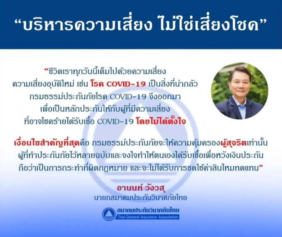 หากพบว่าจงใจติดเชื้อโควิด-19 “ไม่จ่ายเงินประกัน” วันที่ 27 มิถุนายน 2564 นายอานนท์ วังวสุ นายกสมาคมประกันวินาศภัยไทย เผยถึง กรณีที่สื่อสังคมออนไลน์ มีการแชร์ข้อความว่า มีผู้ซื้อประกัน จงใจติดเชื้อโควิด-19 เพื่อหวังรับเงินประกันนับแสนบาทนั้น จึงขอชี้แจงว่า กรมธรรม์ประกันภัยโรค COVID-19 เป็นหลักประกันให้กับผู้ที่มีความเสี่ยง ที่อาจโชคร้ายได้รับเชื้อ COVID-19 โดยไม่ได้ตั้งใจ และเงื่อนไขที่สำคัญที่สุด คือ กรมธรรม์ประกันภัยจะให้ความคุ้มครองผู้สุจริตเท่านั้น