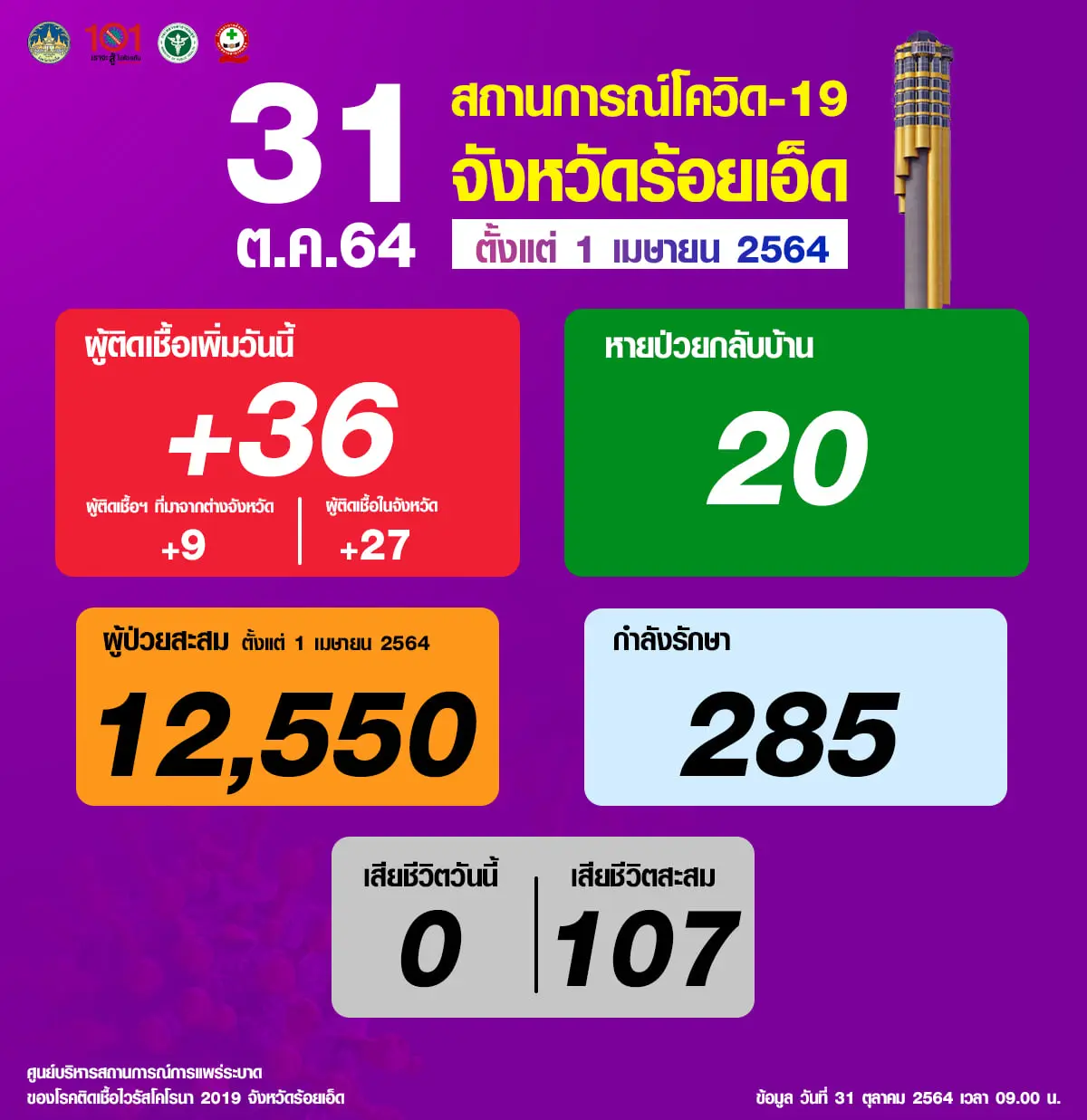 สำหรับ จ.ร้อยเอ็ด มี ผู้ติดเชื้อโควิด 19 รายใหม่ เดินทางมาจากต่างจังหวัด 9 ราย (มาจากพื้นที่ควบคุมสูงสุดและเข้มงวด 9 ราย) และเป็นผู้ติดเชื้อภายในจังหวัดร้อยเอ็ด 27 ราย (สัมผัสใกล้ชิดกับผู้ติดเชื้อโควิด19 ในครอบครัว/ชุมชน 26 ราย , ตรวจคัดกรองทหารกองประจำการผลัดที่2 1 ราย)