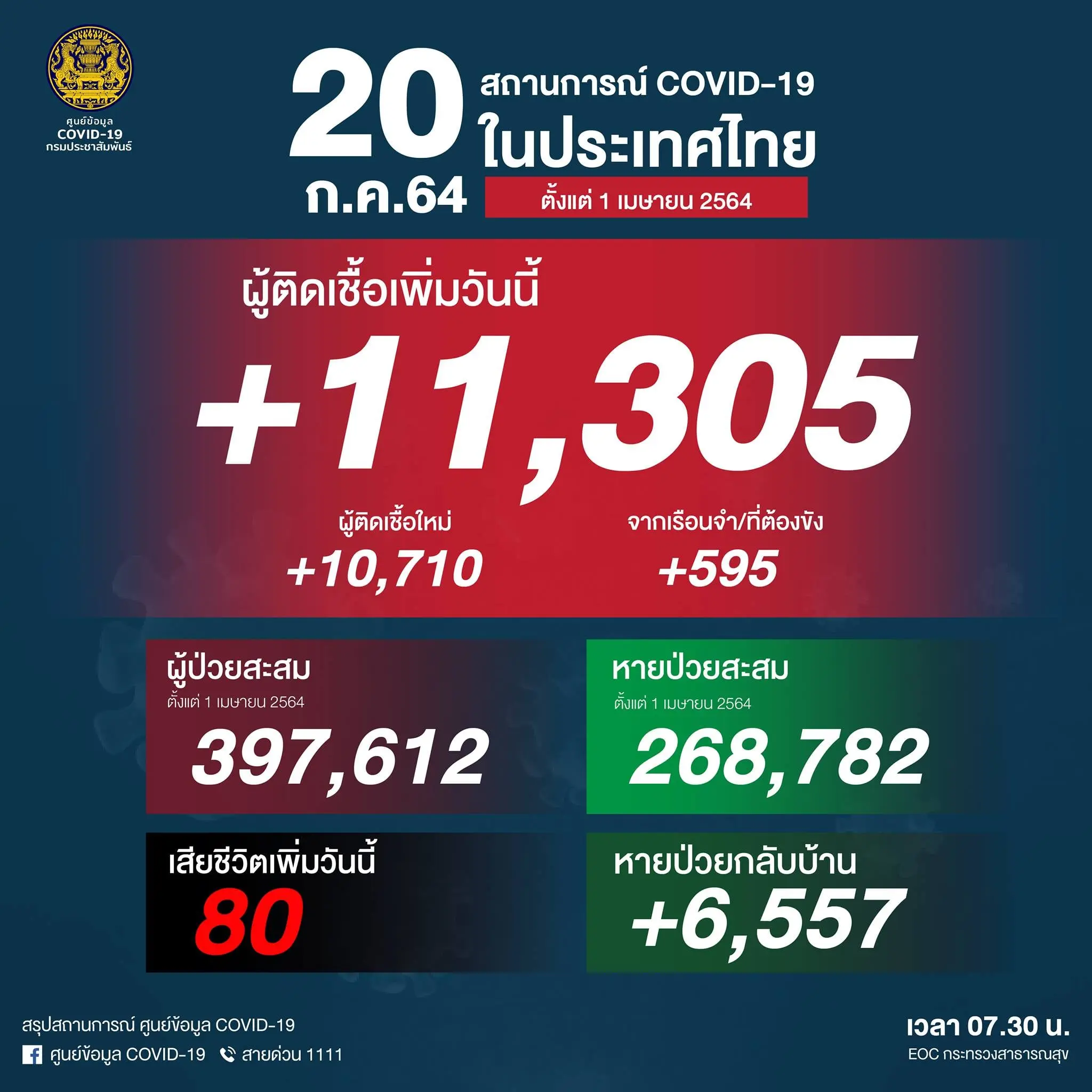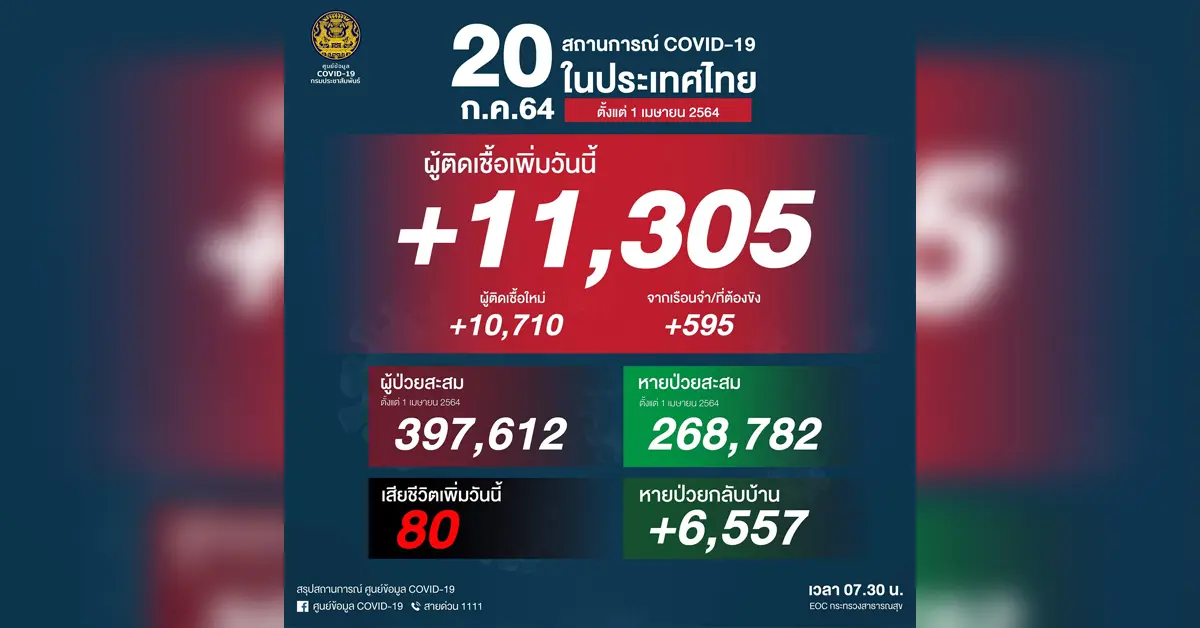 รวม 11,305 ราย จำแนกเป็น ติดเชื้อใหม่ 10,710 ราย ติดเชื้อภายในเรือนจำ/ที่ต้องขัง 595 ราย เสียชีวิต 80 ราย