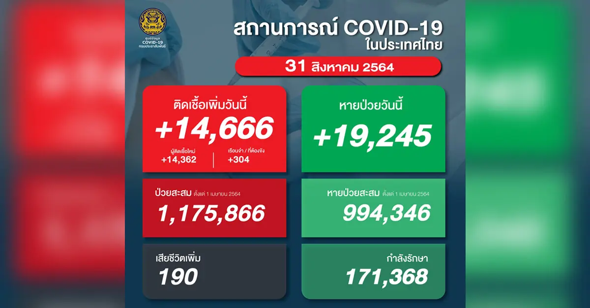 โควิดวันนี้ – รายงานสถานการณ์การแพร่ระบาดของเชื้อโควิด-19 ในวันที่ 31 สิงหาคม 2564 โดยข้อมูลจากเพจเฟซบุ๊ก ศูนย์ข้อมูล COVID-19 พบผู้ติดเชื้อรายใหม่ 14,666 ราย ซึ่งแบ่งออกเป็นสองกลุ่มคือ ผู้ติดเชื้อรายใหม่ 14,362 ราย และผู้ติดเชื้อในเรือนจำ 304 ราย หากนับรวมยอดผู้ติดเชื้อตั้งแต่ช่วงเดือนเมษายนที่ผ่านมานั้น จำนวนผู้ป่วยสะสม 1,175,866 ราย ในส่วนของผู้เสียชีวิตวันนี้ 190 ราย หากนับรวมยอดผู้เสียชีวิตตั้งแต่ช่วงเดือนเมษายนที่ผ่านมานั้น เป็นจำนวน 11,589 ราย