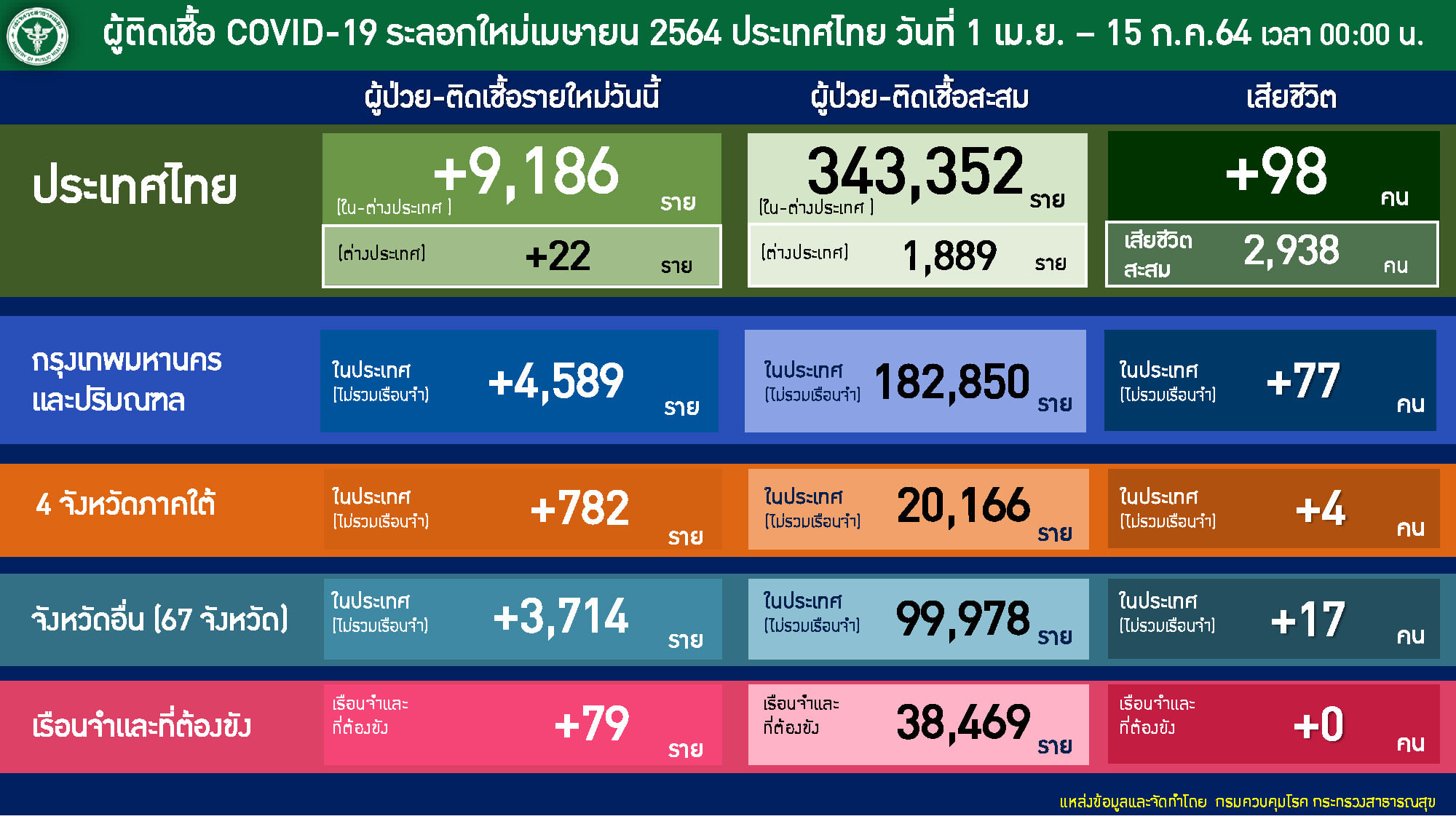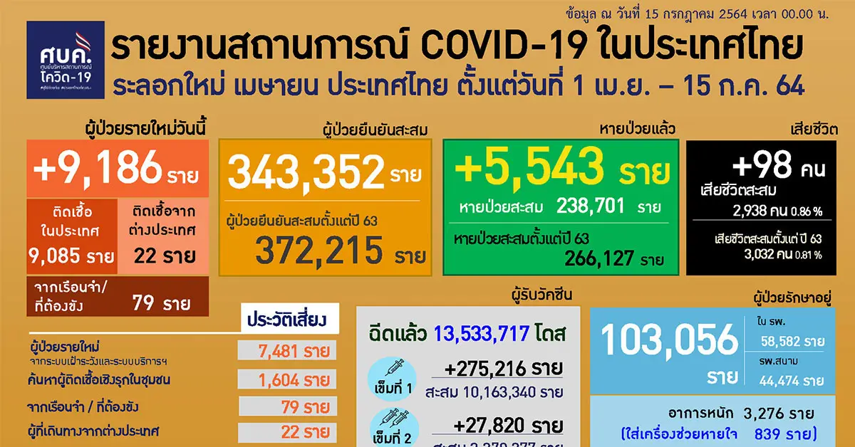 รายงานสถานการณ์การแพร่ระบาดของเชื้อโควิด-19 โดยศูนย์บริหารสถานการณ์โควิด-19 ของรัฐบาล(ศบค.) ในวันที่ 15 กรกฎาคม 2564 พบผู้ติดเชื้อรายใหม่ 9,186 ราย โดยจำแนกเป็นผู้ติดเชื้อรายใหม่จำนวน 9,107 ราย และผู้ติดเชื้อในเรือนจำ 79 ราย โดยนับรวมผู้ป่วยติดเชื้อสะสมตั้งแต่ช่วงเดือนเมษายนที่ผ่านมาเป็นจำนวน 343,352 ราย