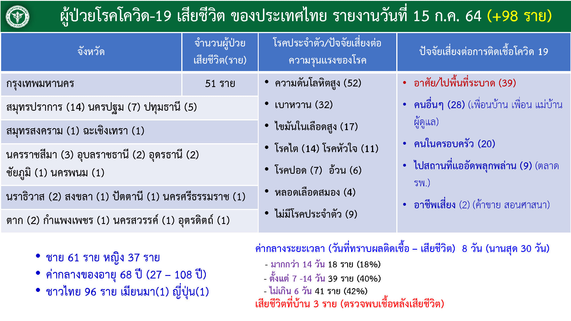 - ในวันนี้มีผู้เสียชีวิตจำนวน 98 ราย โดยนับรวมผู้เสียชีวิตสะสมตั้งแต่ช่วงเดือนเมษายนที่ผ่านมาเป็นจำนวน 2,938 ราย โดยส่วนมากผู้เสียชีวิตเป็นกลุ่มที่อาศัย หรือ อยู่ในพื้นที่แพร่ระบาดของเชื้อโควิด